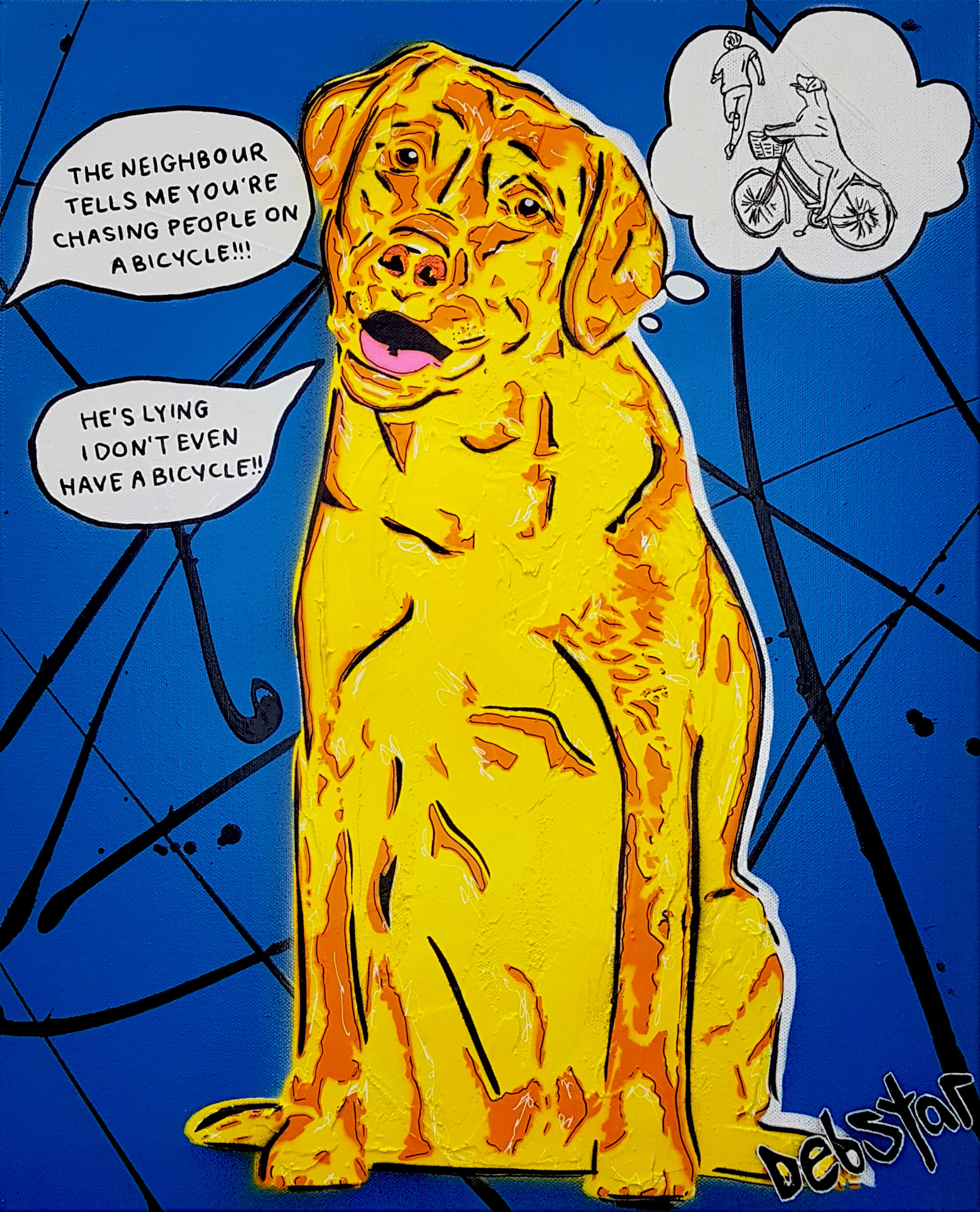 It has been created with stencils, layered upon a vibrant blue base with texture added to the dogs body.