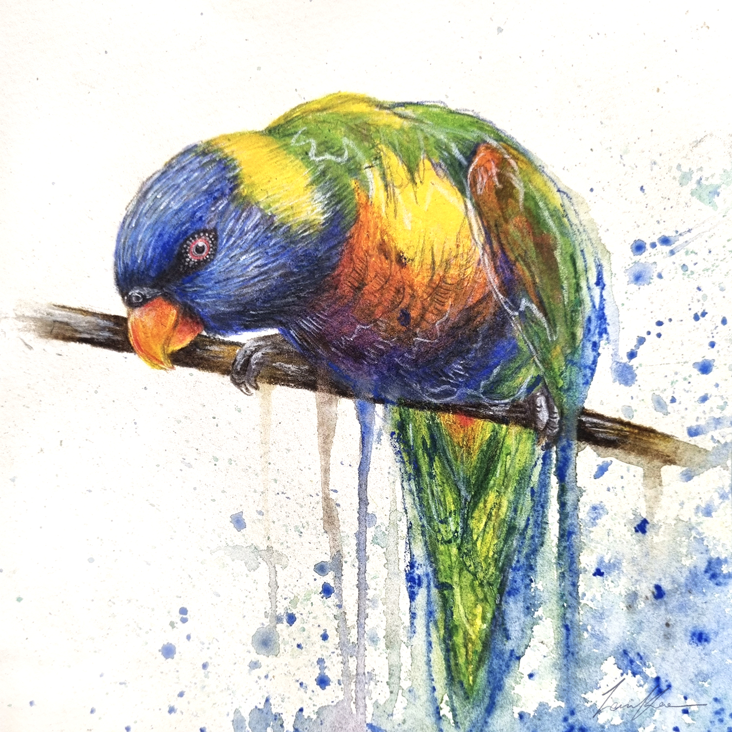 Everyone loves a cheeky Lori! This playful watercolour captures a Rainbow Lorikeet by Sydney artist Leni Kae cheekily peers out at the viewer, inviting a moment of lightness and joy. The lorikeet’s vibrant gaze reflects the humour, colour, and spirit of these birds, embodying the uplifting theme of joy through both personality and palette.