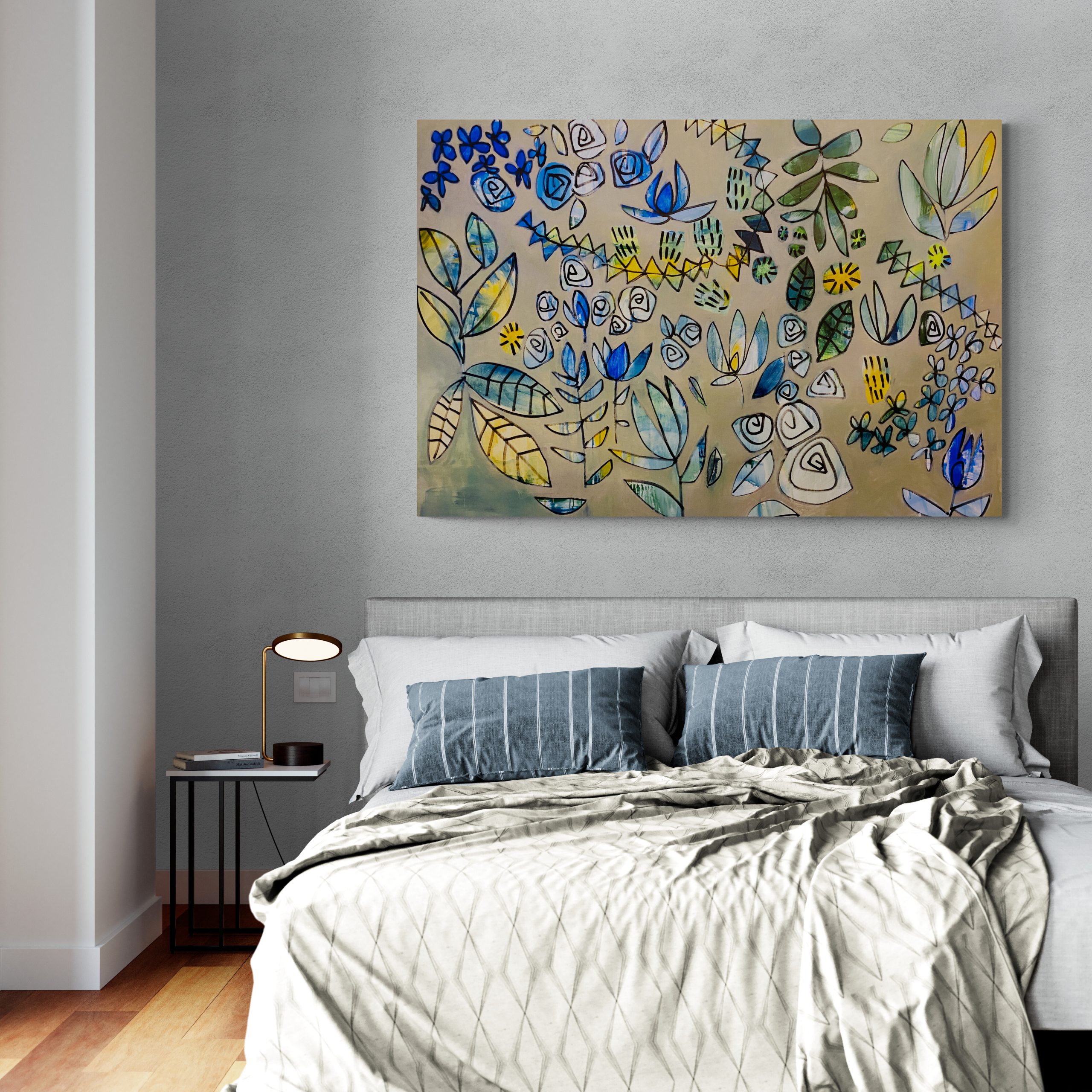 “This artwork is part of my ‘Organic Garden Collection’. I’m constantly drawn to botanical shapes and I paint them quite obsessively through an abstract and very intuitive process. Like I’m fossicking in nature, looking for the beauty that lies within the oasis. The shapes in this piece are recurring themes in my work.Â