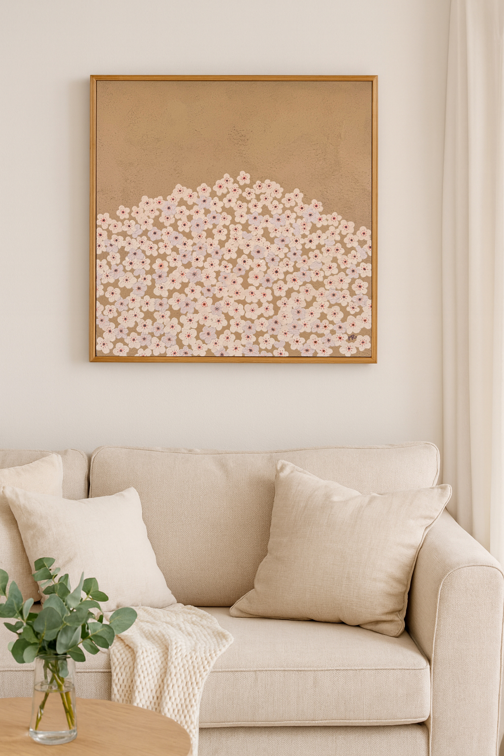 Quiet Bloom is a contemporary minimalist abstract artwork inspired by the fleeting softness of cherry blossom, interpreted through gentle gestures, subtle texture and soft colour fields.