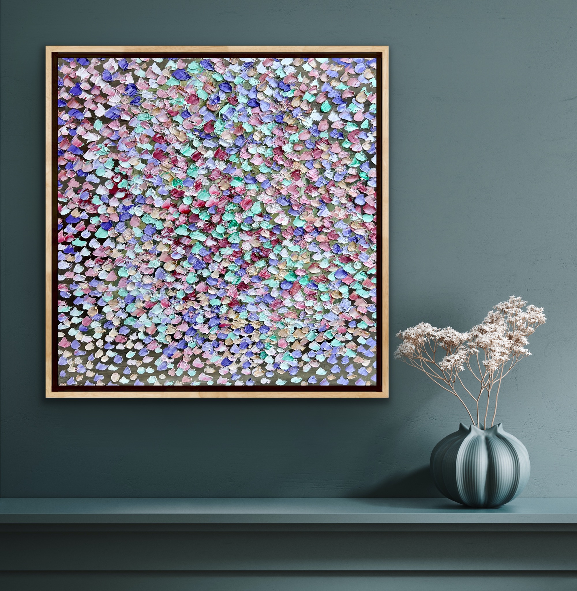 Cherry Ripe by Theo Papathomas a painting of beautiful bouquet of cherry , wisteria petals weeping on to the landscape making it a very happy painting with a soft pallet of colours. Petals are painted in thick rich oil paints with a pallet knife to capture the richness of the colours of the petals and to give a lot of depth to the painting. Weeping cherry, wisteria petals and leaves from the forest creating a veil of colours, dancing over the land. Hope with this s work it makes the viewer feel very peaceful and tranquil. The painting does not come with an external frame.This painting is signed and dated 2022 at the back of the painting and comes with a certificate of Authenticity
