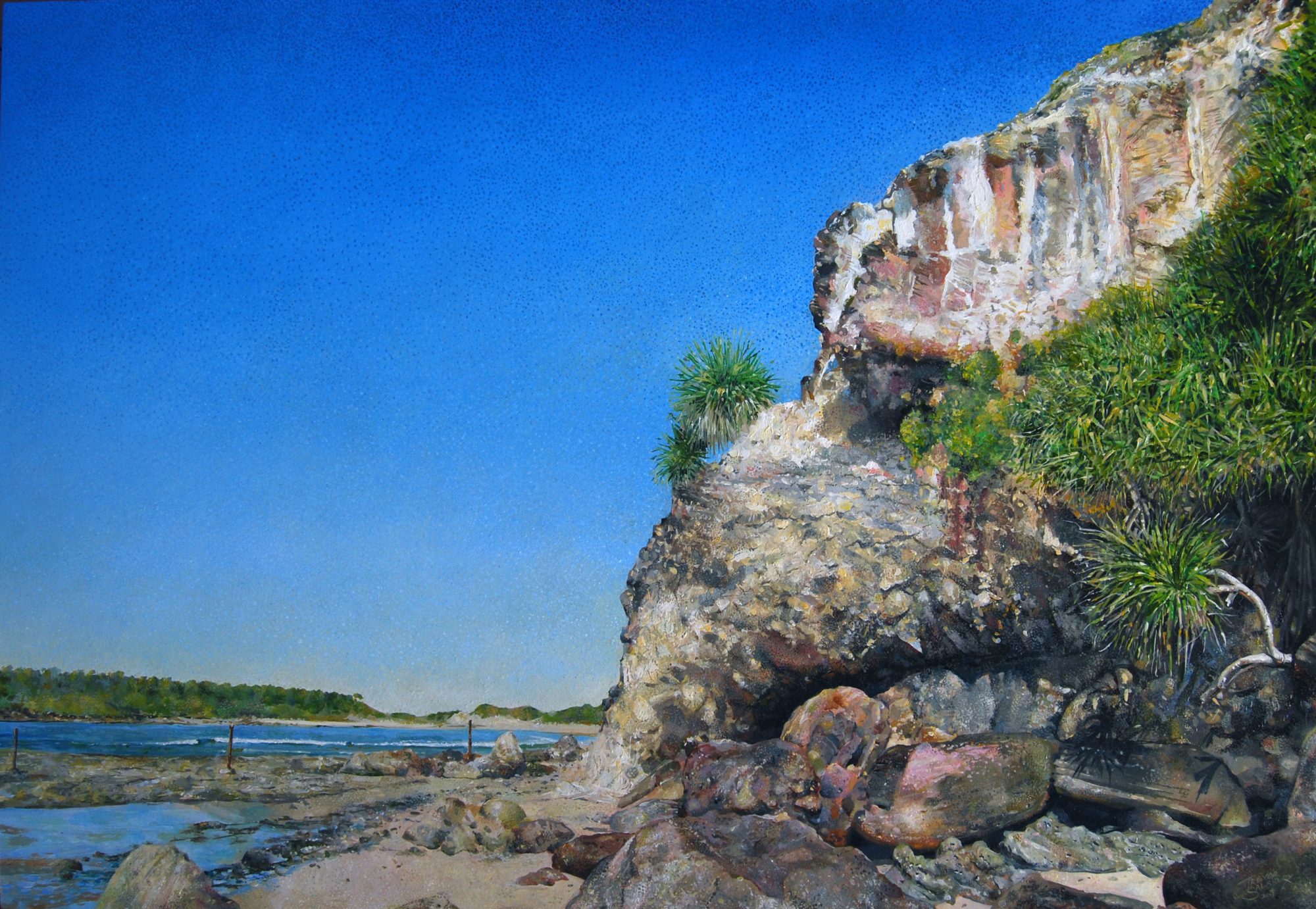 This is a painting of Chinamans Beach Northern NSW.It was a crisp autumn day when I first saw the cliffs. Under the classic blue Australian sun the shapes looked surreal. I knew I had to paint it. I choose a detailed style, as I thought it would best suit the subject.