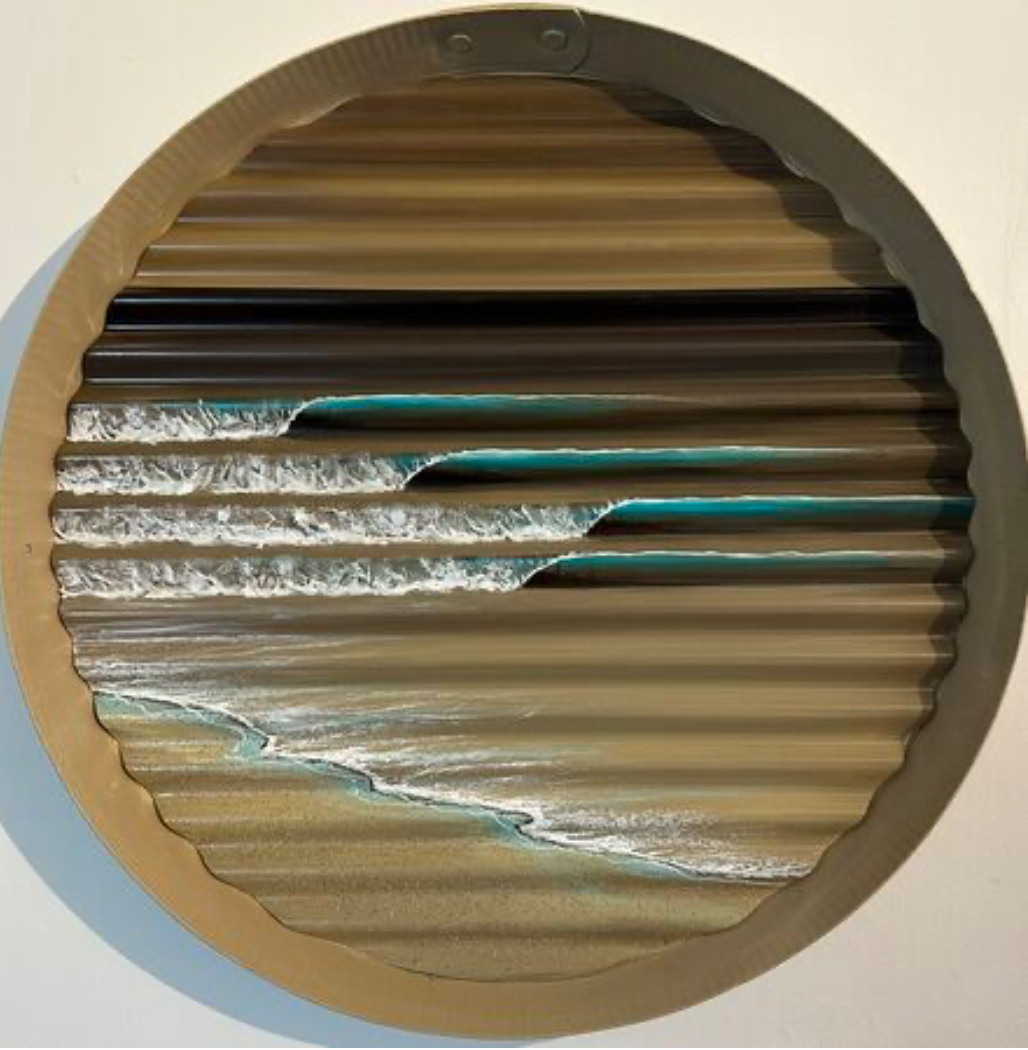Chocolate spearmint waves by Adam Stanley – in this painting I have created a 3D depth in the waves by painting on corrugated polycarbonate. Â I have also framed it in a wind barrel ring.