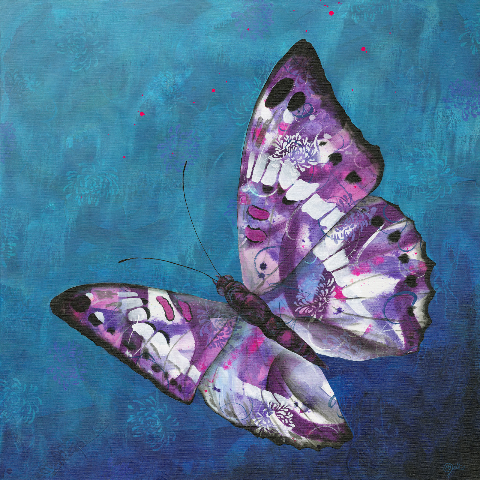 Limited edition giclee print. Â The image features a butterfly determinedly making it’s way through the rain. Â The background also features subtle chrysanthemum details, hence the title ‘Chrysanthemum Rain’.