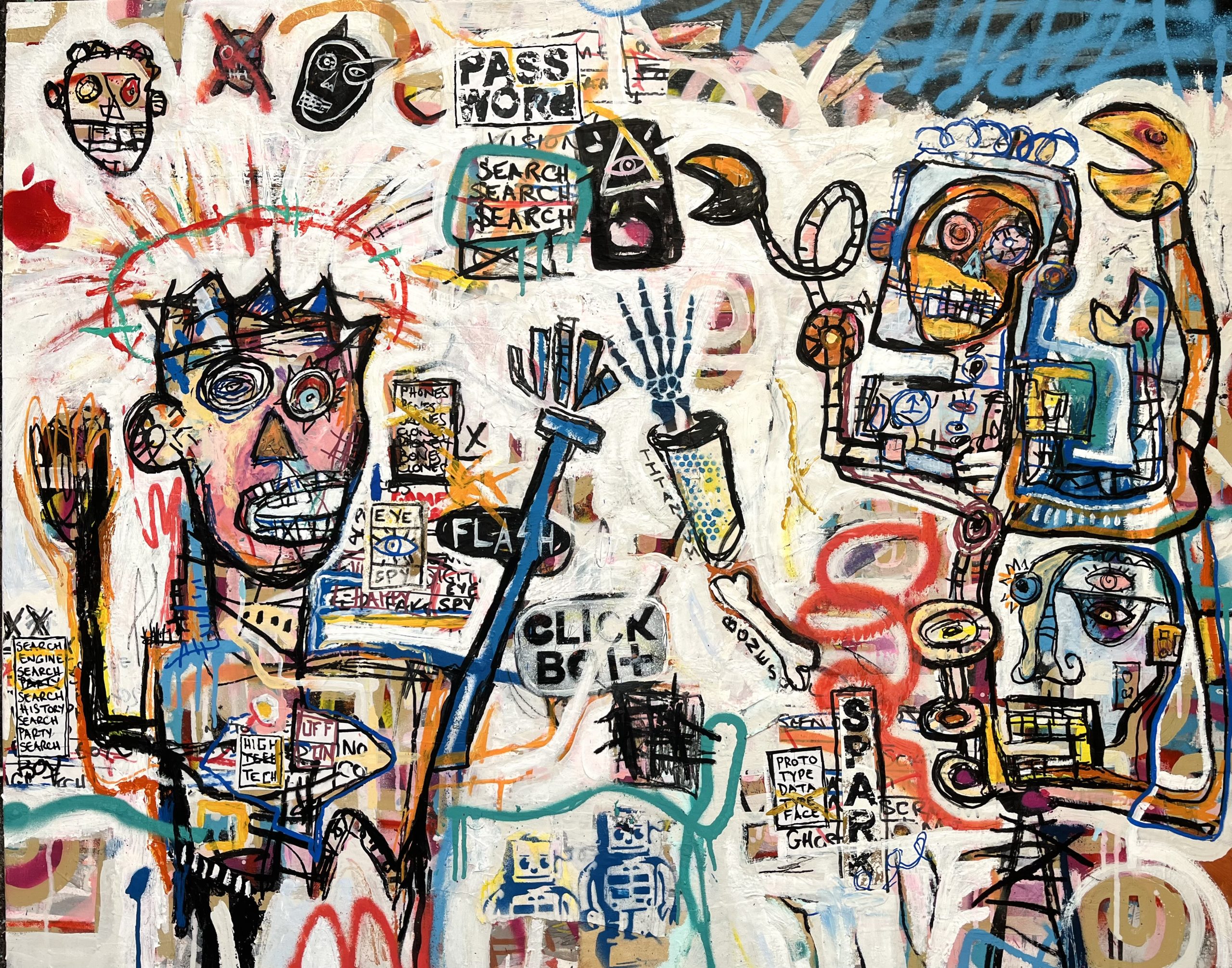 Grab a blender and add some pop art, expressionism, spray paint, ideas about robots and out of control Al taking over the world, and you will end up with an artwork that looks something like this, a Neo Pop statement piece and will give maximum impact to any room.