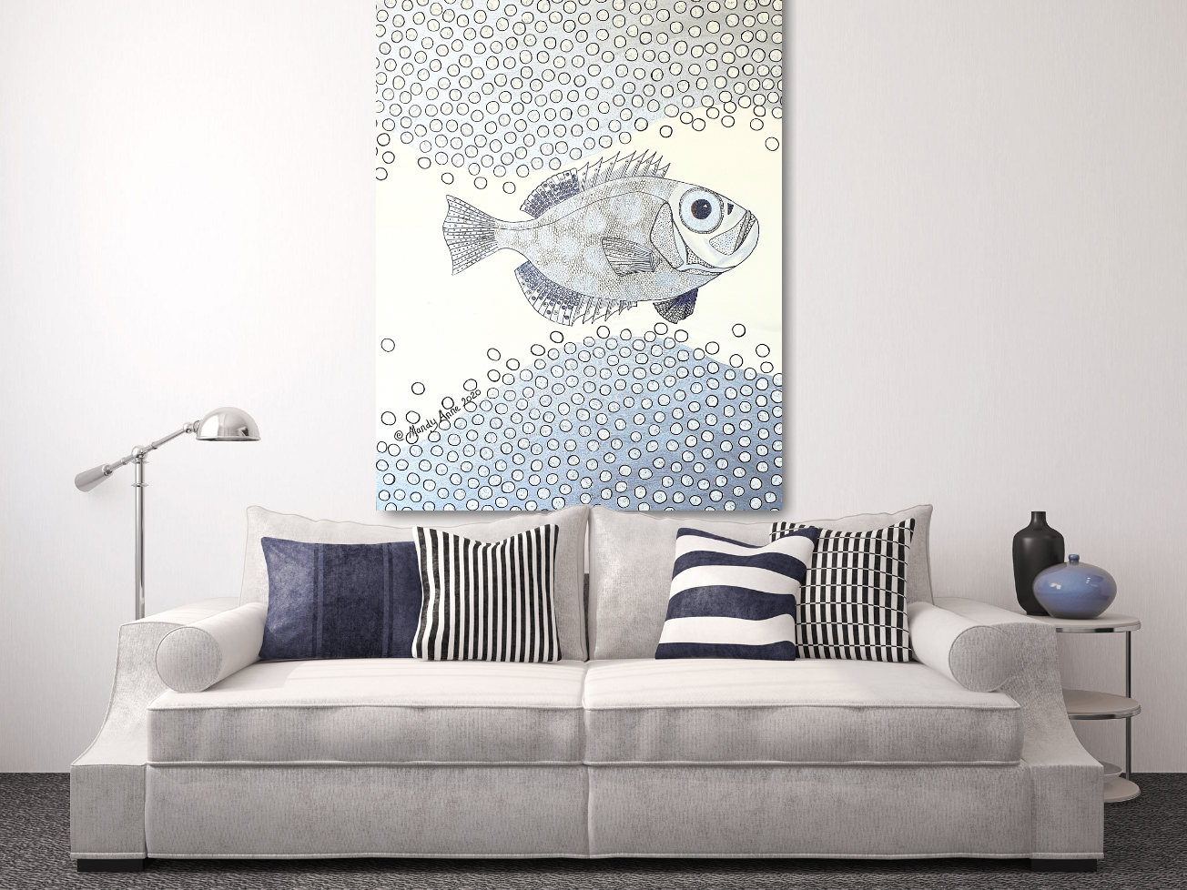 A metalic grey, and off white acrylic and ink fish study … using circular patterns in repitition – calming, cool and uncomplicated. Signed, dated by artist & sealed, ready to hang – with a certificate of authenticity.