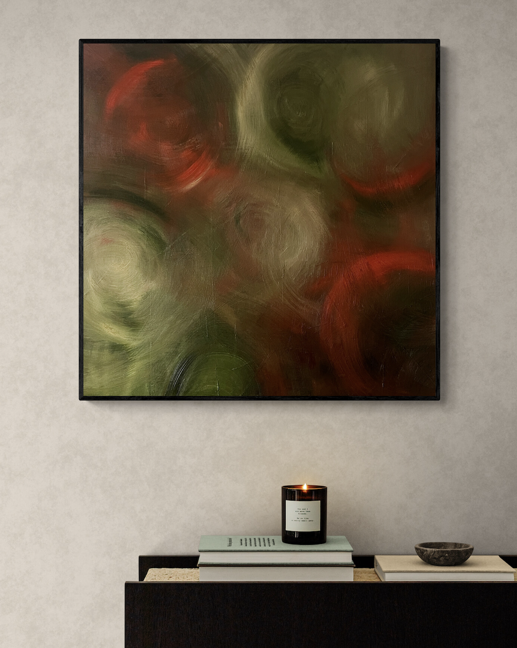 Circular Dimension by Tara Cunniffe – Oil painting with hues of dark green, red, yellow and brown. An abstract expression based upon the subconscious thoughts of the mind. Signifying both dark and light emotions merging together represented in wide circular brush strokes, crossing over one another. The first layer embodies discrete line work that create texture amongst the circular shapes. The dimensional layers overlap evoking a 3D viewpoint looking through the lens of the mind.