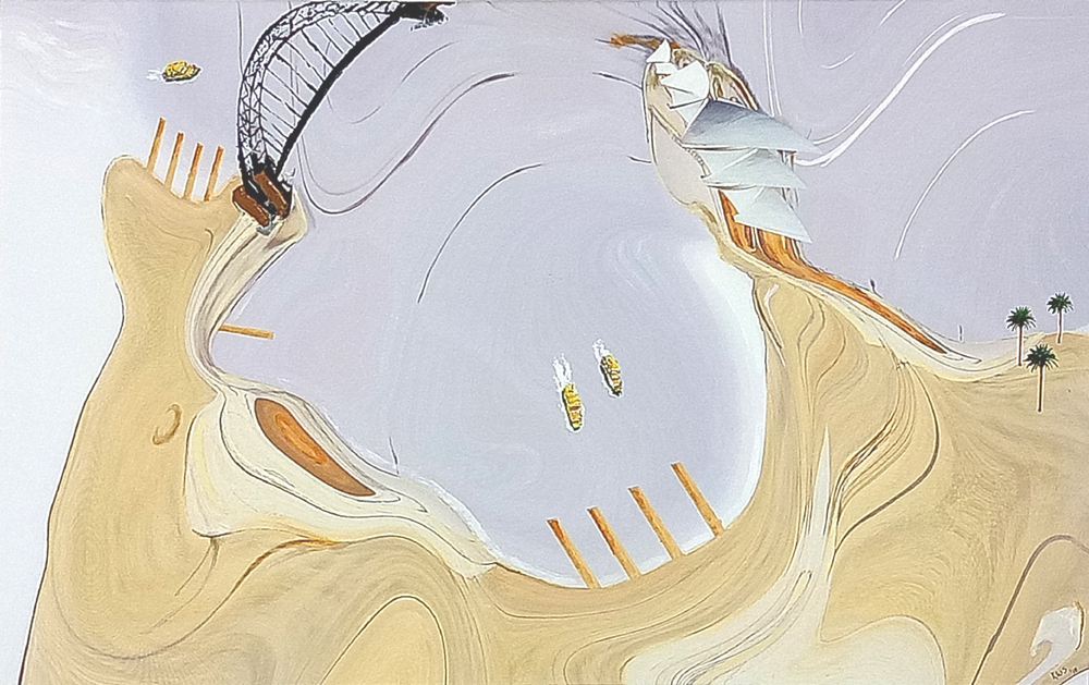 I have sought to emphasise these dominant landmark features of the Quay. The myriad of commercial and residential buildings that line the Quay’s foreshore are thus reduced to swirls of flowing/connecting colour. A ‘hint’ of the neighbouring Botanical Garden is provided through a simple stand of palms.