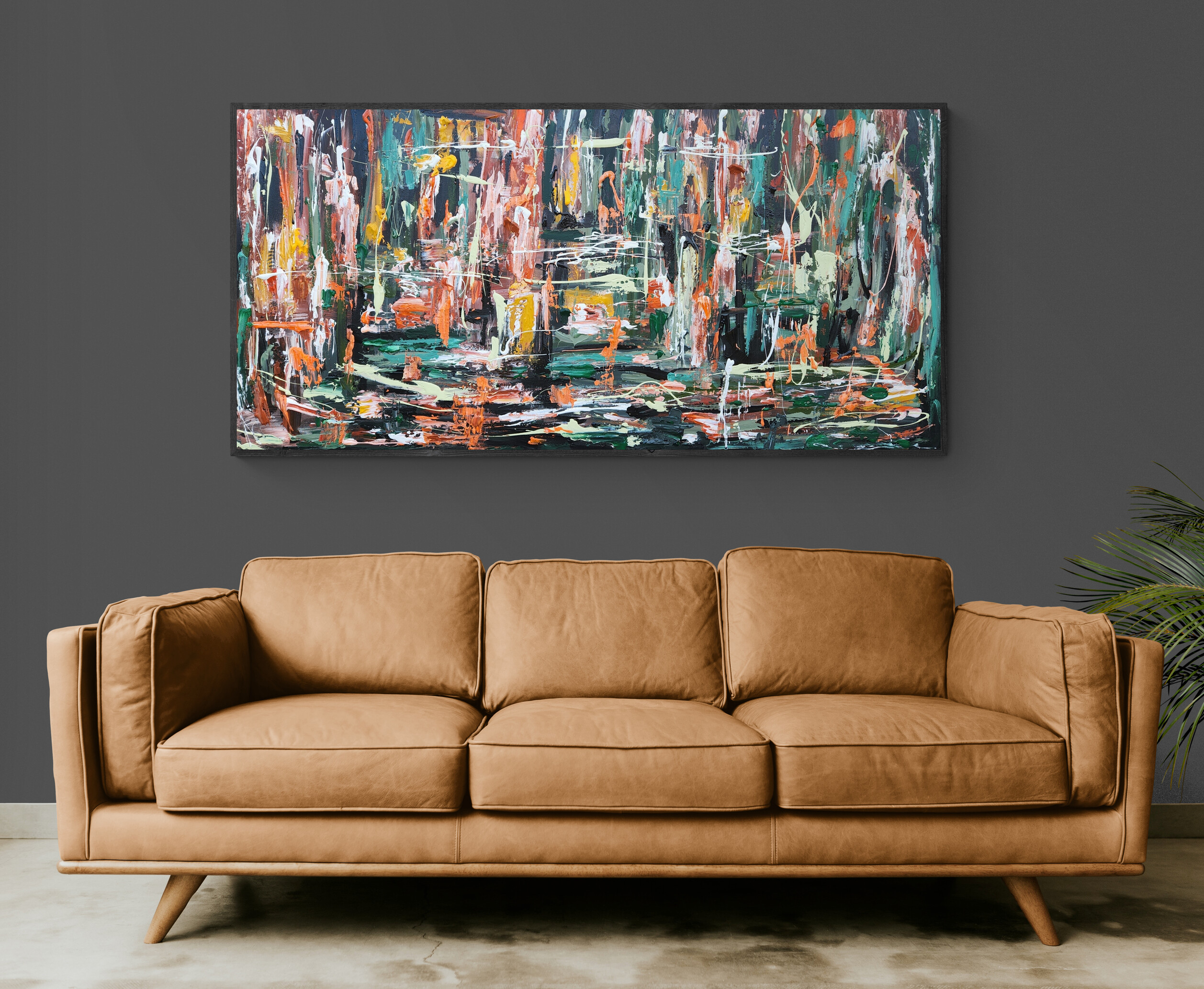 This beautiful modern piece is made with lots of layers and drips of acrylic paint. It was varnished for a protection of color. It has a wire at the back and is ready to hang. Signed with a certificate of authenticity. Unframed.
