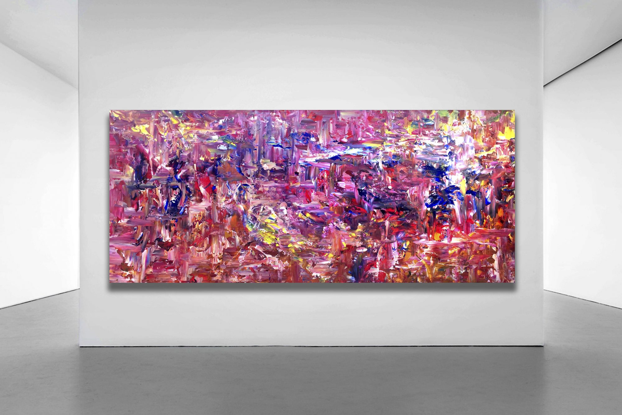 This work is painted on 12 oz gallery canvas and has been sealed with varnish. The canvas is hand-stretched onto a frame is 204 cm in width by 87 cm in height.