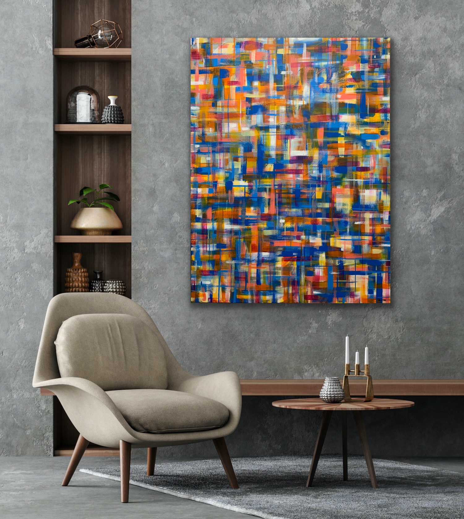 This vibrant, exciting, colourful abstract is inspired by the City of Melbourne. Multilayered and multifaceted, the unique and creative vibe of Melbourne is captured. A happy, healthy, groovy, “happening” artwork to enhance your zone. Communicating the energy, activity, abundance and sustainable progression of Melbourne.