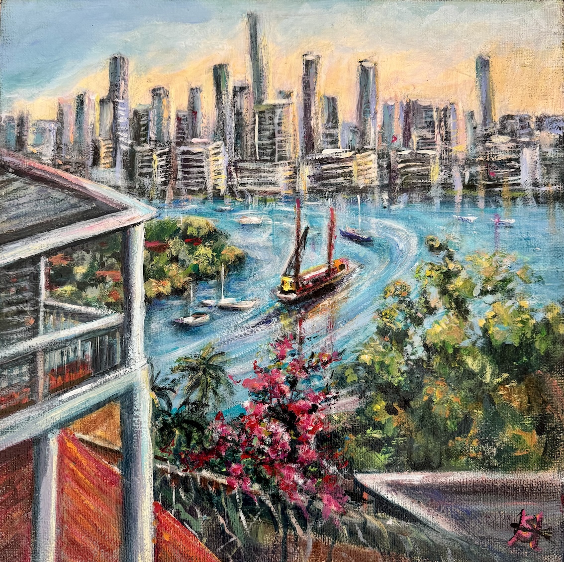 Sue’s inspiration for this small acrylic landscape came from walking up a very steep part of Hamilton, Brisbane where some new houses were being built on a curve of the road. The views were spectacular, and it was lovely to see the activity looking down on the river.