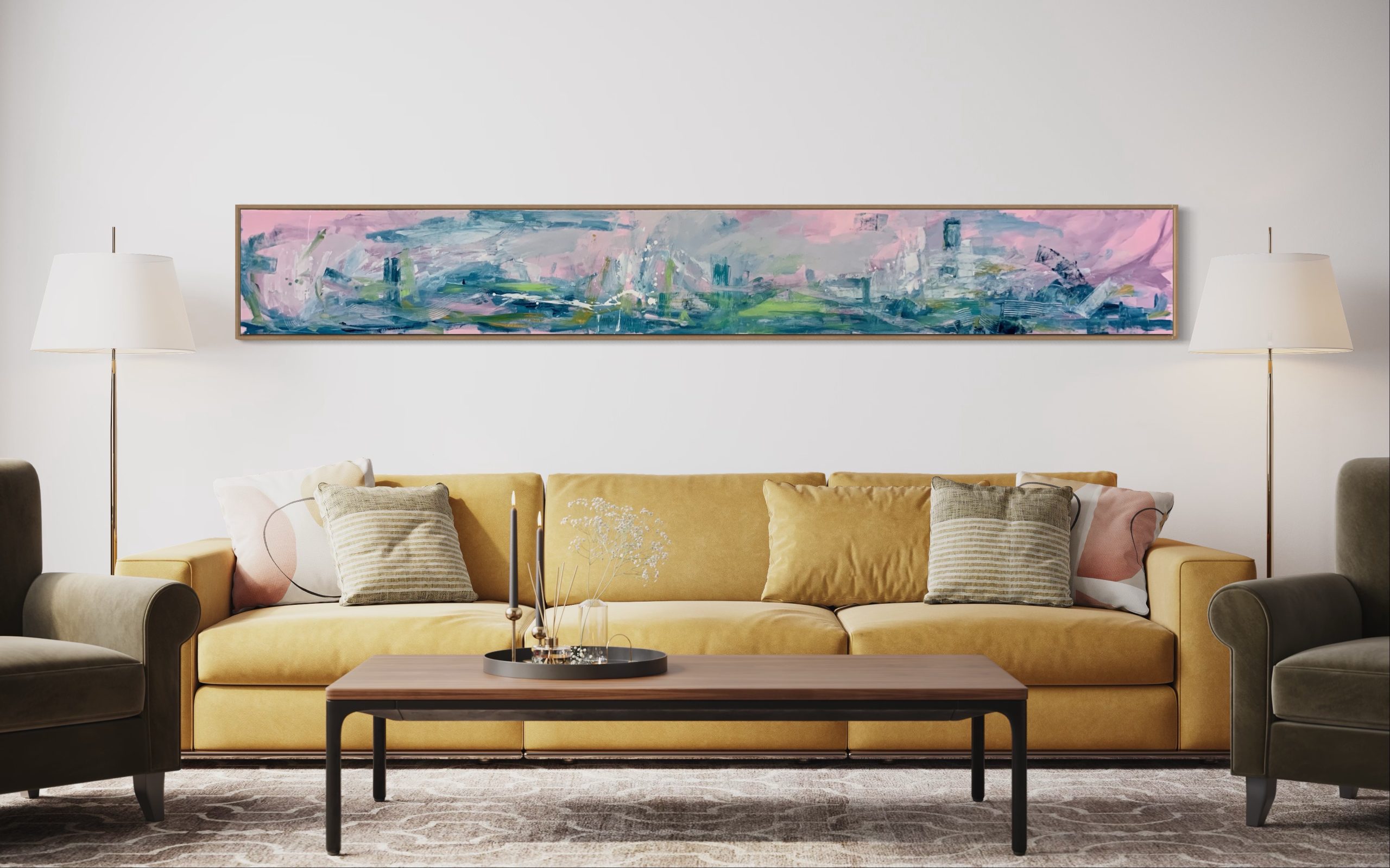 The painting is a large and mesmerizing piece of art that captures the imagination of the viewer with its unique blend of colors and abstract cityscape elements. The background is predominantly pink and grey, with hints of purple and abundance of blue and green at the bottom, providing a stunning contrast to the rest of the painting.