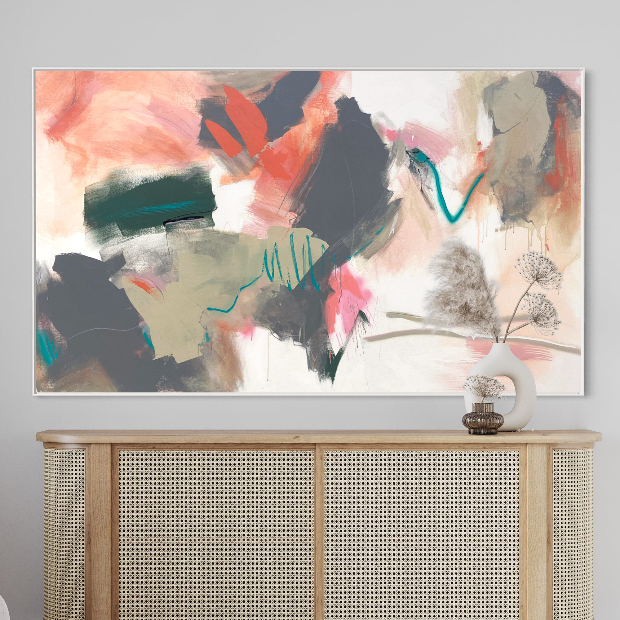 The complex palette of blush, pink, peach, apricot, sage and teal green, grey, white, beige and a touch of black in this abstract expression piece is about finding that special place for self reflection.