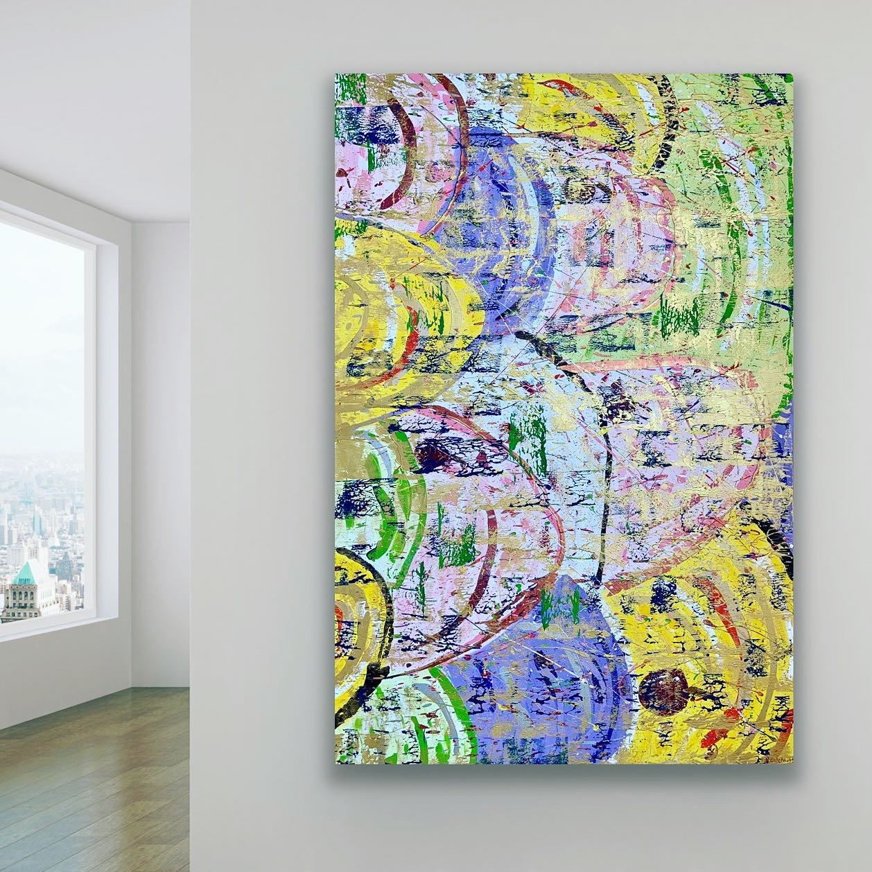 ‘Cleopatra’ is about all things royal, lost treasure, ancient artefacts, hieroglyphics, and pharaohs. This painting is made up of four layers with the final layer consisting of pale gold, green and blue. It symbolises communication, strength and wealth. At night, the light turns the painting into treasure by reflecting all the gold while the background layers show through during the day.