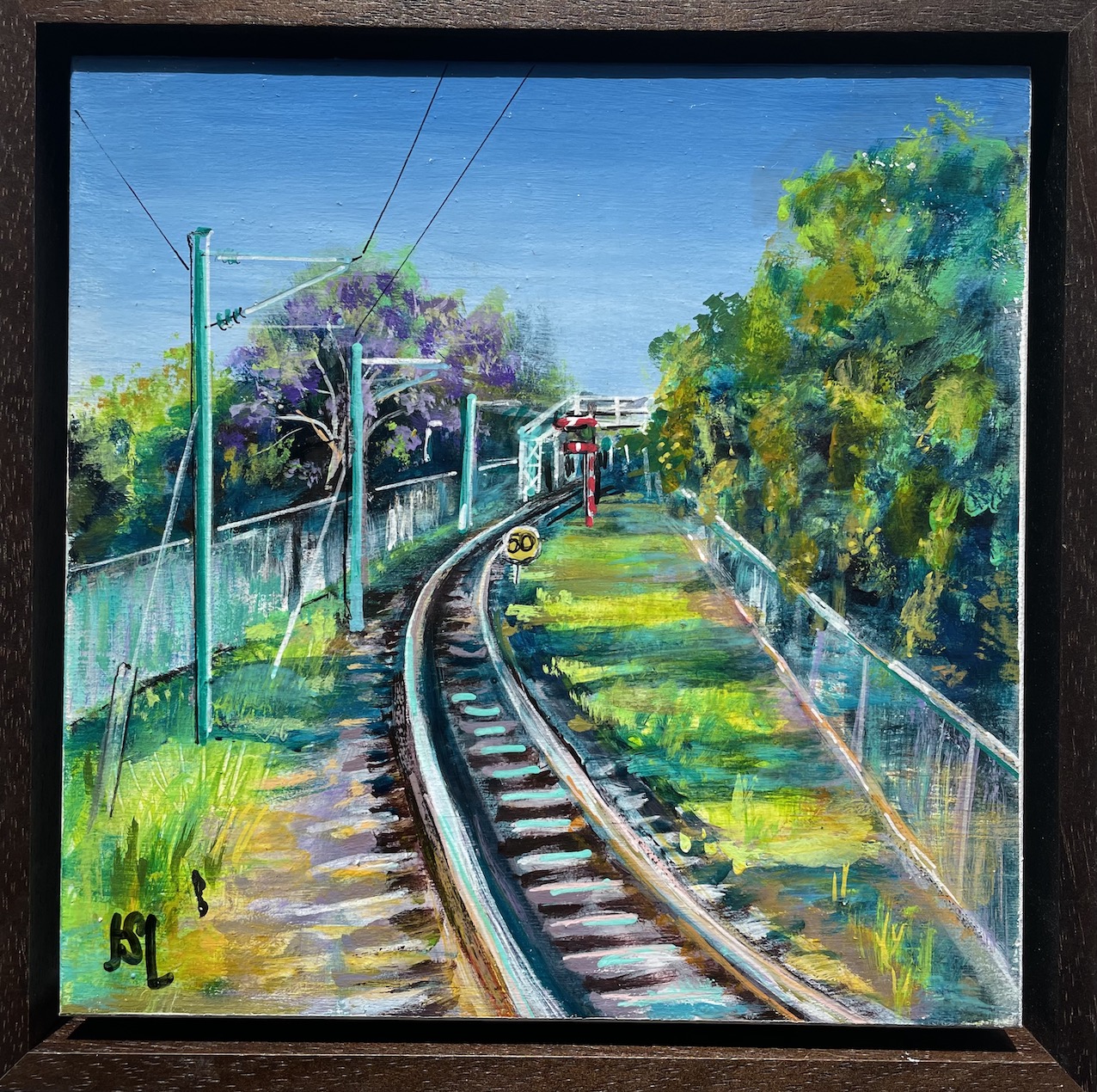 Clickety Clack by Sue Hill– A small square painting of railway tracks and signals and trees. Sue was inspired to paint this scene as she walks past the tracks most days of the year and she finds it is pretty when the grass is green, the jacarandas are in blossom and the shadows cast interesting shapes.  She painted it in acrylics and acrylic pens in on square board.
