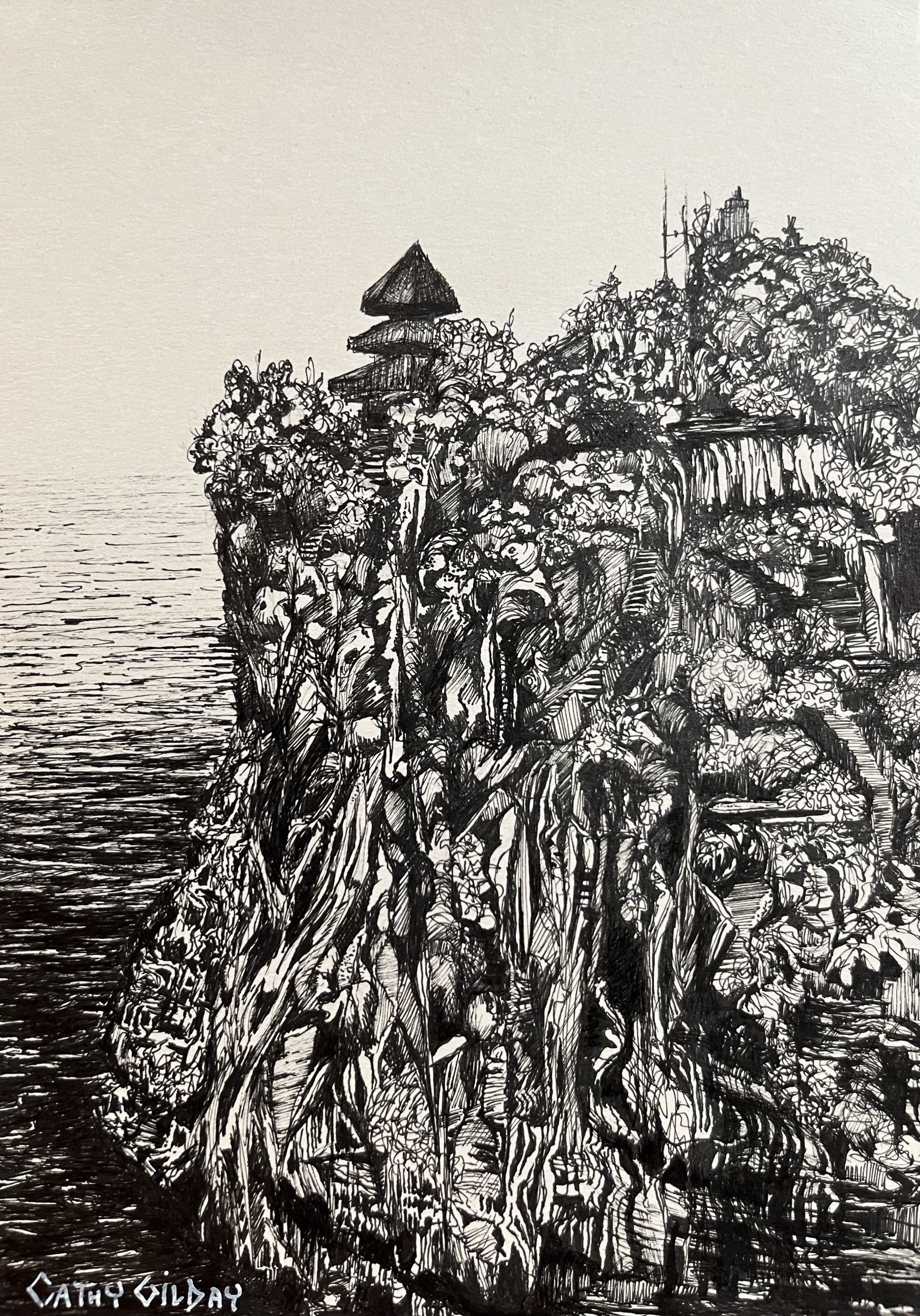 Cliff top Temple in Uluwatu by Cathy Gilday – Built in the 11th century, the Uluwatu temple is purched on the edge of a 70 meter high cliff above the ocean, in Bali. This Hindu temple is an incredible place to visit and felt compelled to record my experience with this intricate drawing. Unframed.
