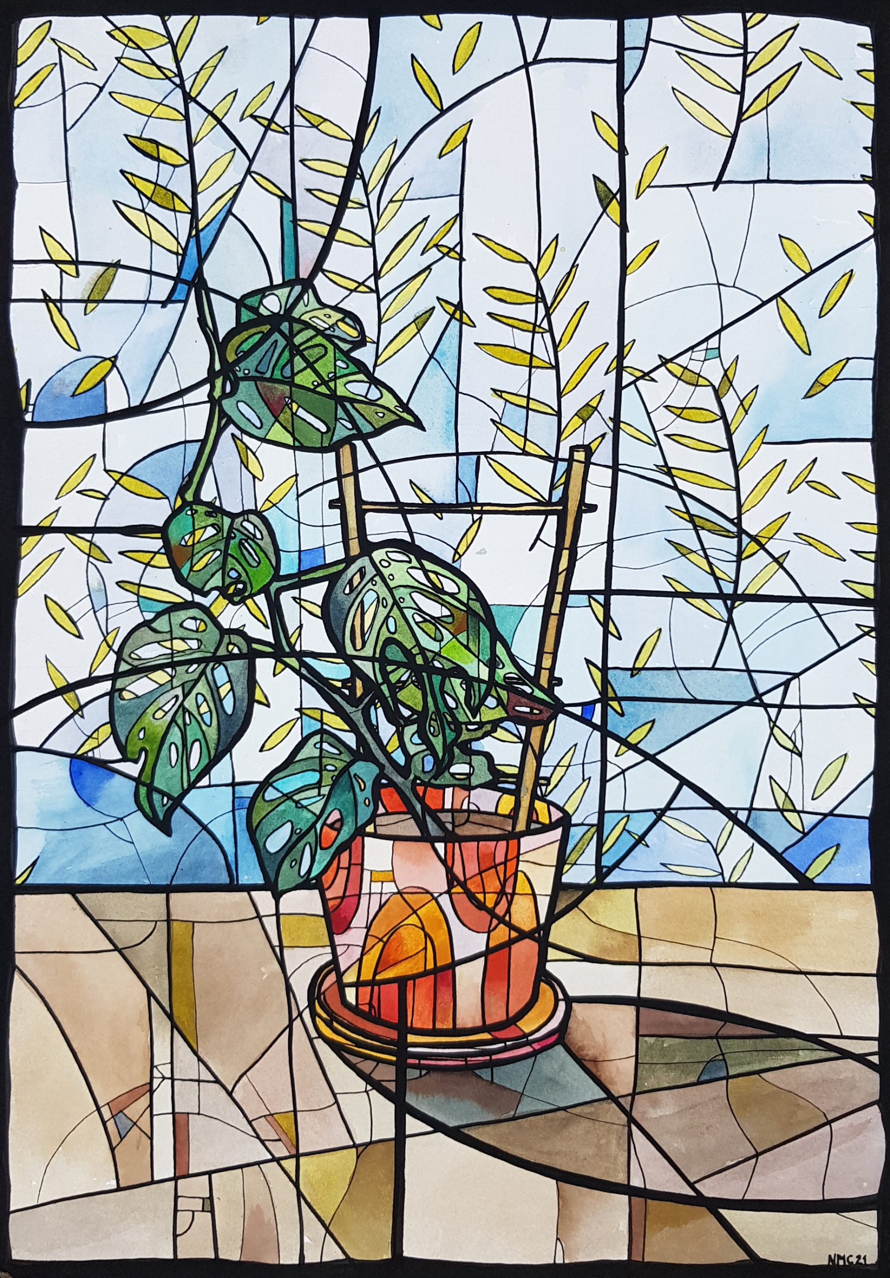 Climbing by Nicola Cowie – This is a watercolour and ink artwork depicting the beautiful Monstera Adansonii or Swiss Cheese Vine, named that for its hole-filled leaves.