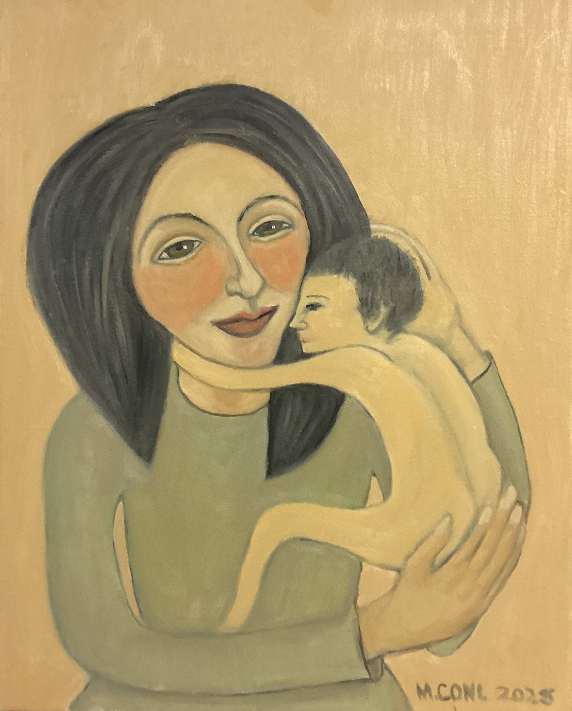 This painting has been a theme for Margaret since she started painting.The feeling for the theme emanates from childhood after seeing iconic images .The very idea of mother and child has always seemed sacred and the role of parent guiding offspring is fundamental to good society .The wars we witness now destroy and shatter these sacred bonds and will never enrich the society of aggressors.Margaret would love all wars and aggression to end and cooperation and peace prevail. Italian primed canvas has been stretched over à frame .Good quality oil paint has been used and a light glaze used to seal the painting .D hooks have been applied and the painting is ready to hang .