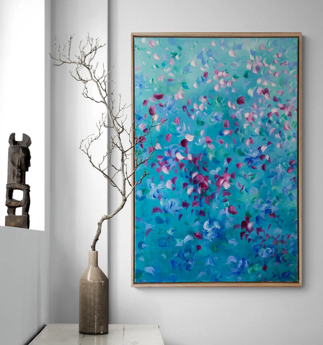 Petals chase around the canvas in this abstract floral work that celebrates the joy of flowers every day.