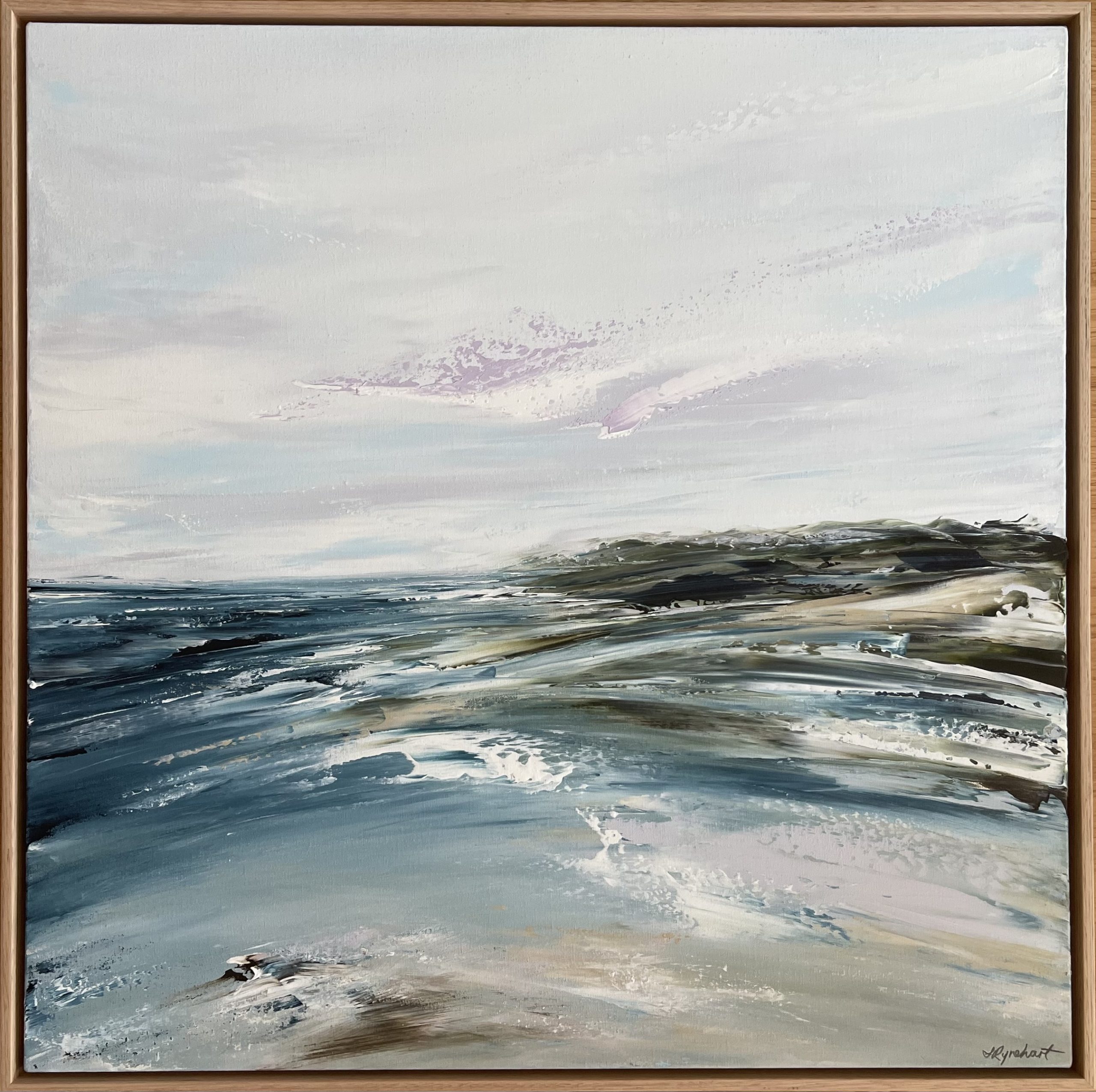This expressive artwork in sea blues, subtle greens, cool greys and soft lilacs is my interpretation of my happy place. It is created with palette knives on artist quality cotton canvas, framed in solid Tasmanian Oak, satin varnished, and comes with a COA.
