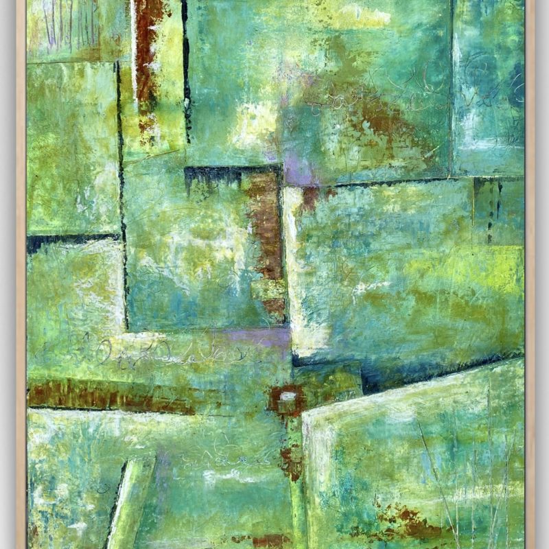 On this piece, the background was first created using cut/ torn collaged papers. Papers taken from discarded mags, books, junk mail and packaging materials. Once the background was dry, it was completely deconstructed and destroyed. Tearing layers off to reveal random elements showing underneath. Paint has been added in areas to even things back out. The end result is loose, abstract surfaces and a very textural piece.