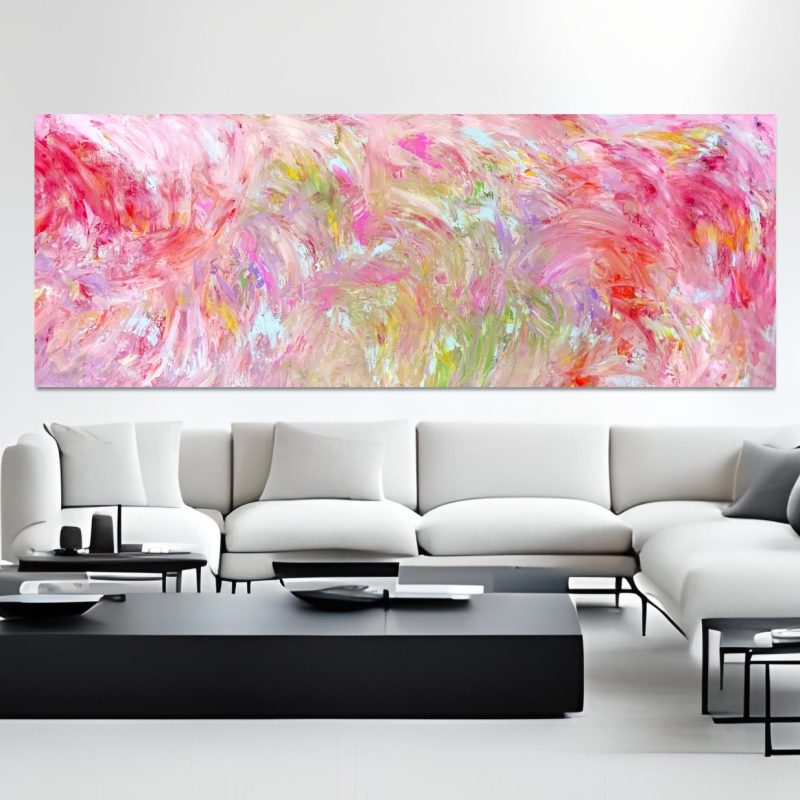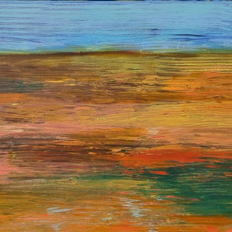 The piece is on stretched canvas. 2 coats of gloss varnish have also been applied to protect the artwork. The gloss finish really makes the colours pop and gives the work a glassy finish. It has a wire at the back and the collage continues on the edges so it is ready for your walls, or you may wish to add a frame directly through Art Lovers during purchase.