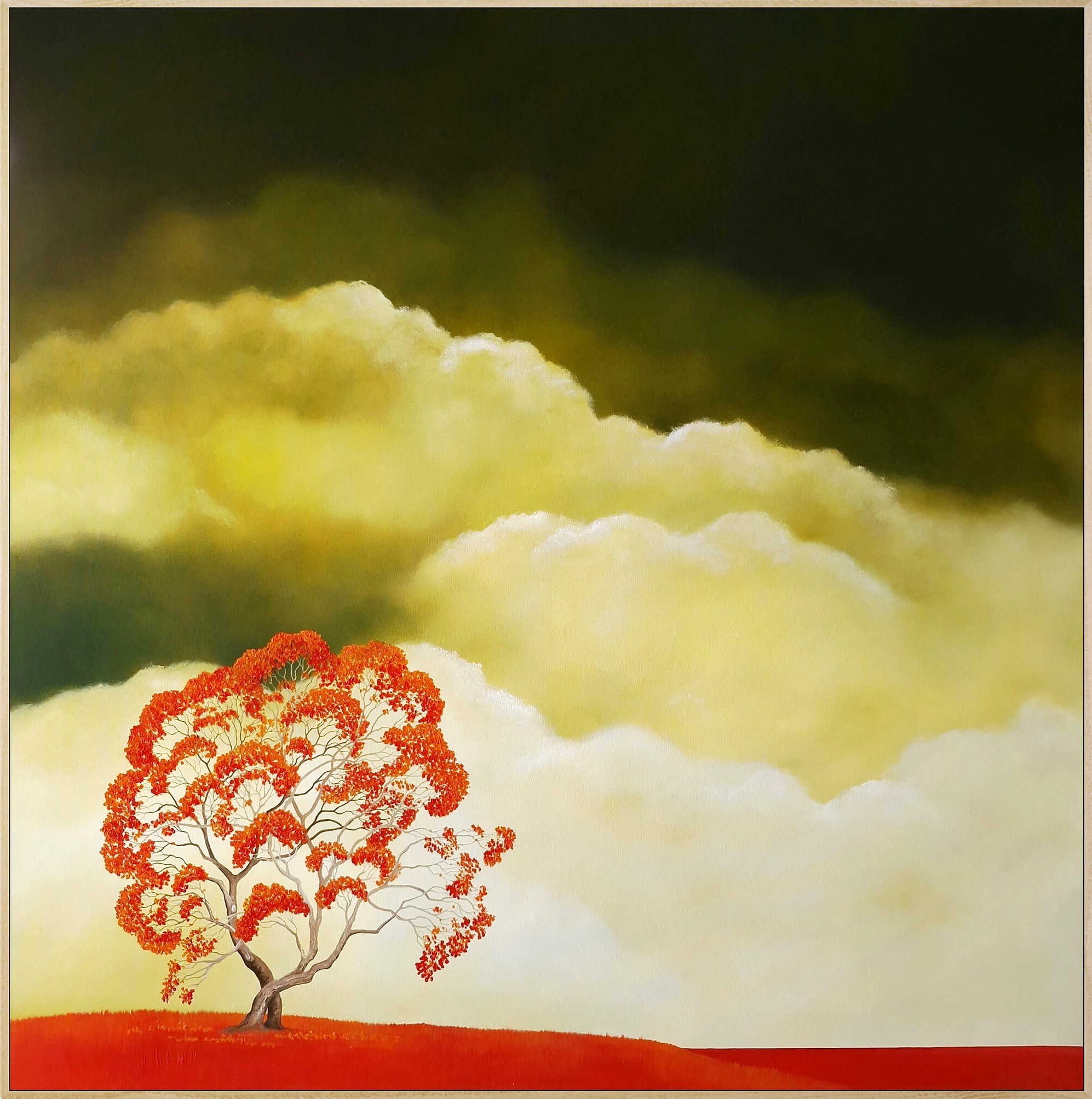 In Cloudborne, the sky takes centre stage. Green-gold clouds swell and drift, their luminous presence carrying both weight and lightness, like a promise held aloft. Beneath them, a bold red tree rises steady against a straight horizon line of deep red earth. The contrast between sky and land becomes a conversation — movement above, stillness below; fragility in the clouds, endurance in the tree.