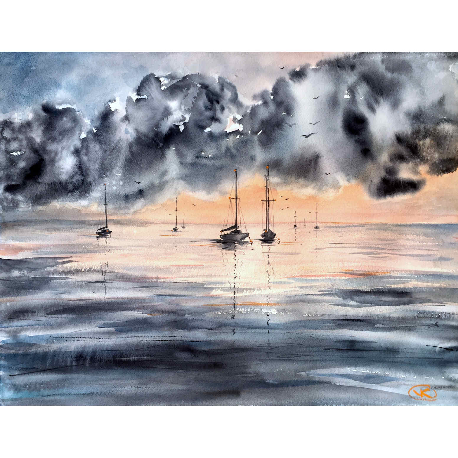 Australian seascape, Ocean, Boat, Clouds, Sunset. Original Watercolour on 300 gsm paper.