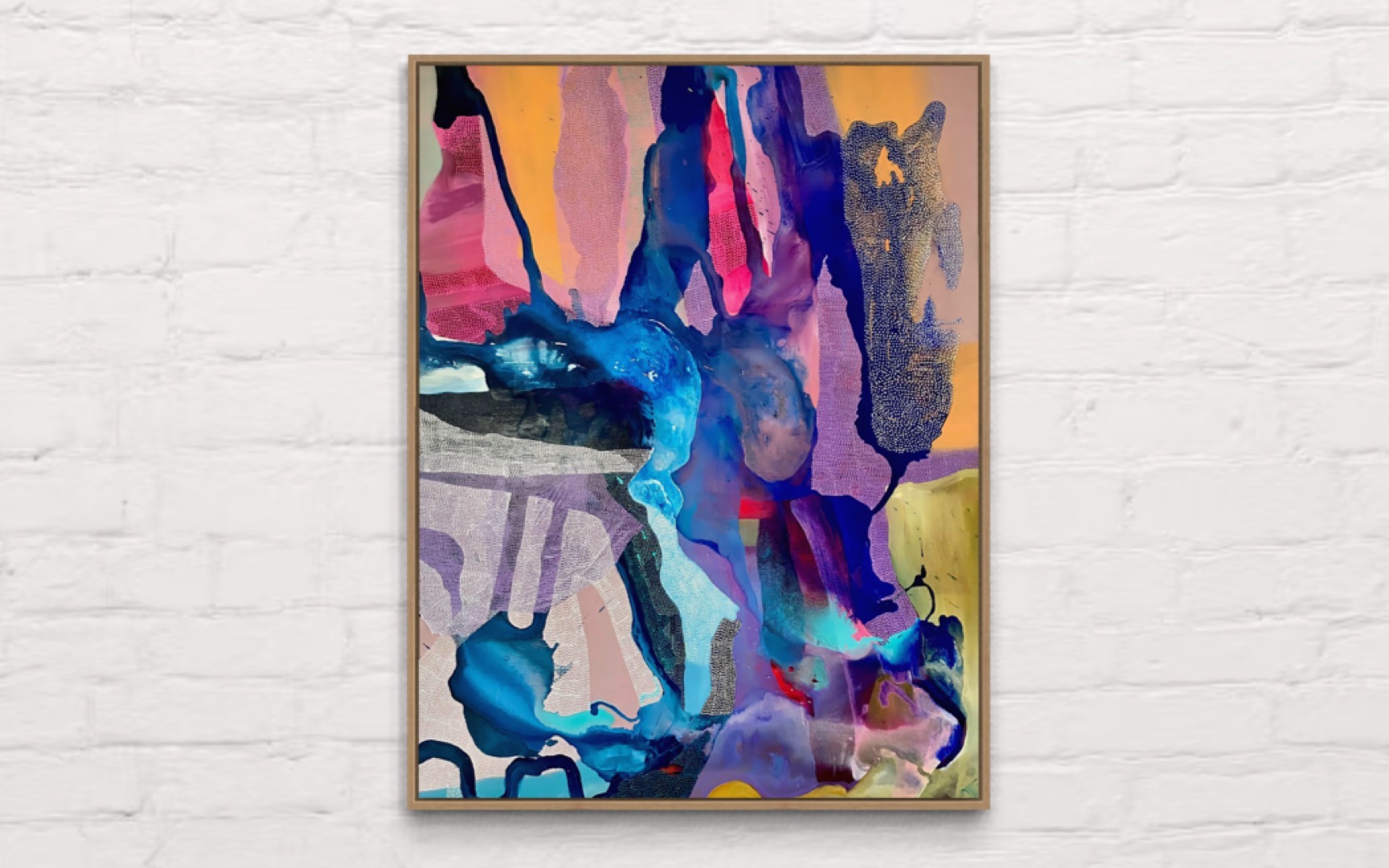 It has areas of pattern in the form of tiny coloured dots in both contrasting and complimentary colours. This is a bold, statement artwork combining multiple techniques.