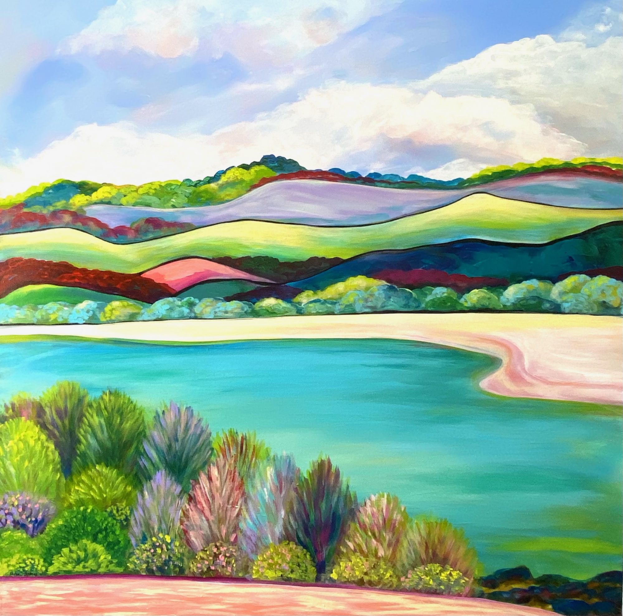 Inspired by the colours of the tidal creeks at the coast and the beautiful aqua, greens and blues produced by the varying depth of the water at low tide. White clouds starting to take on the colours of sunset  start to roll in above the ranges and sandy tracks lead the way home. This one really gives that coastal feel to a room and the blues, greens and aquas will certainly compliment a Hamptons style decor!
