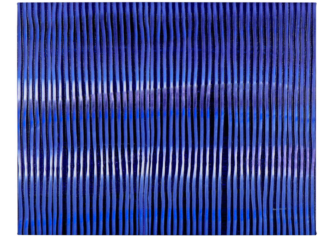 More recently, Namok has been living and working in Cairns as well as completing private and corporate commissions in Brisbane studios. Her paintings continue to reflect both traditional stories and contemporary themes associated with cultural, social and environmental concerns. Through a technique developed by watching her grandmother drawing in the sand, Namok creates her signature finger-patterned linear arrangements by pulling her fingers through the paint.