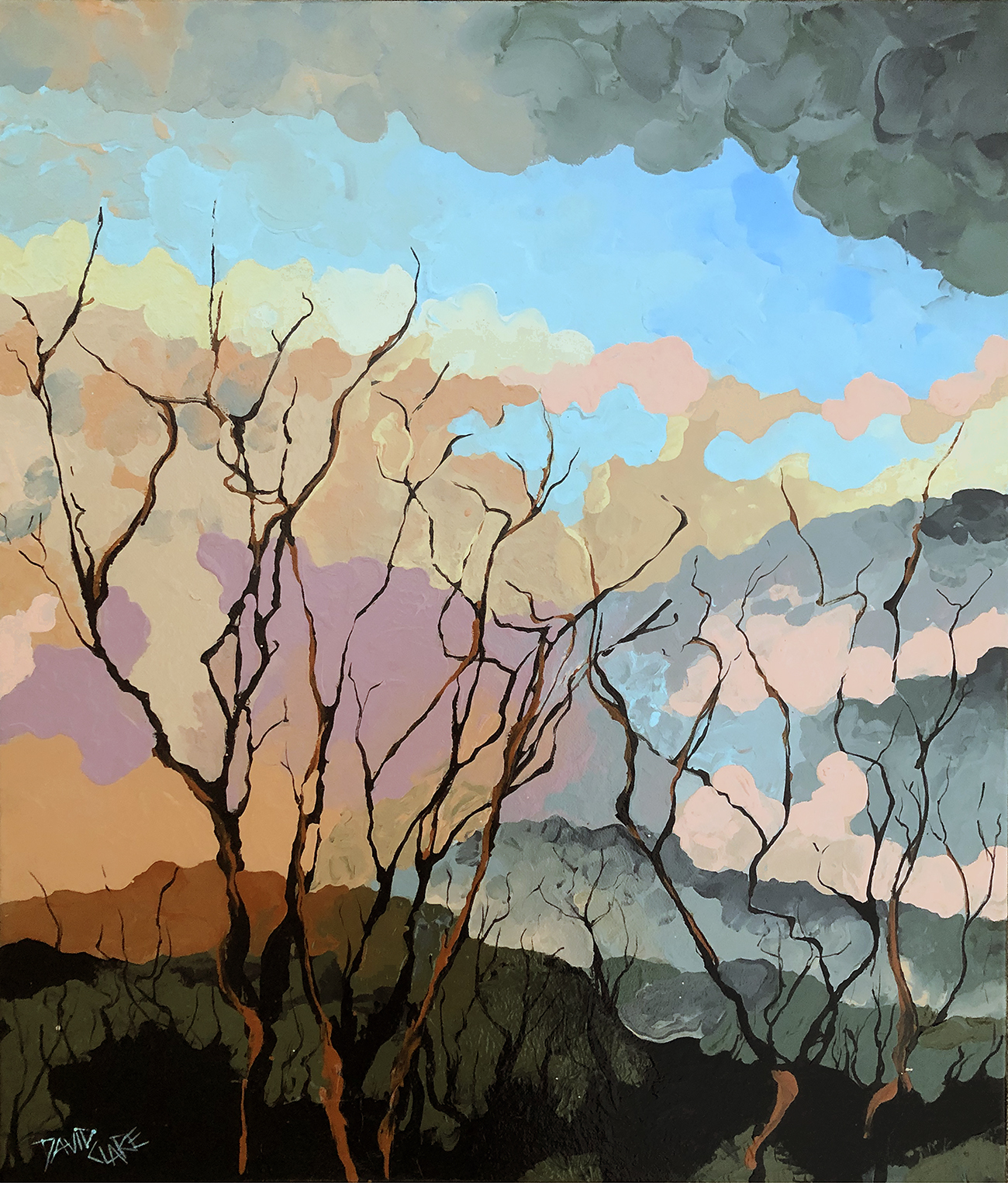 Clouds Of Colour painting by David Clare – Inspired by sunlight filtering through trees, these colourful, moody clouds show a typical, possibly smokey Australian bush scene.