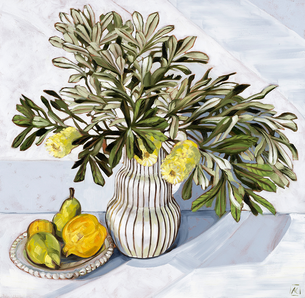 From my series of coastal banksias, a selection of leaves and banksia flowers with a plate of pears and quince