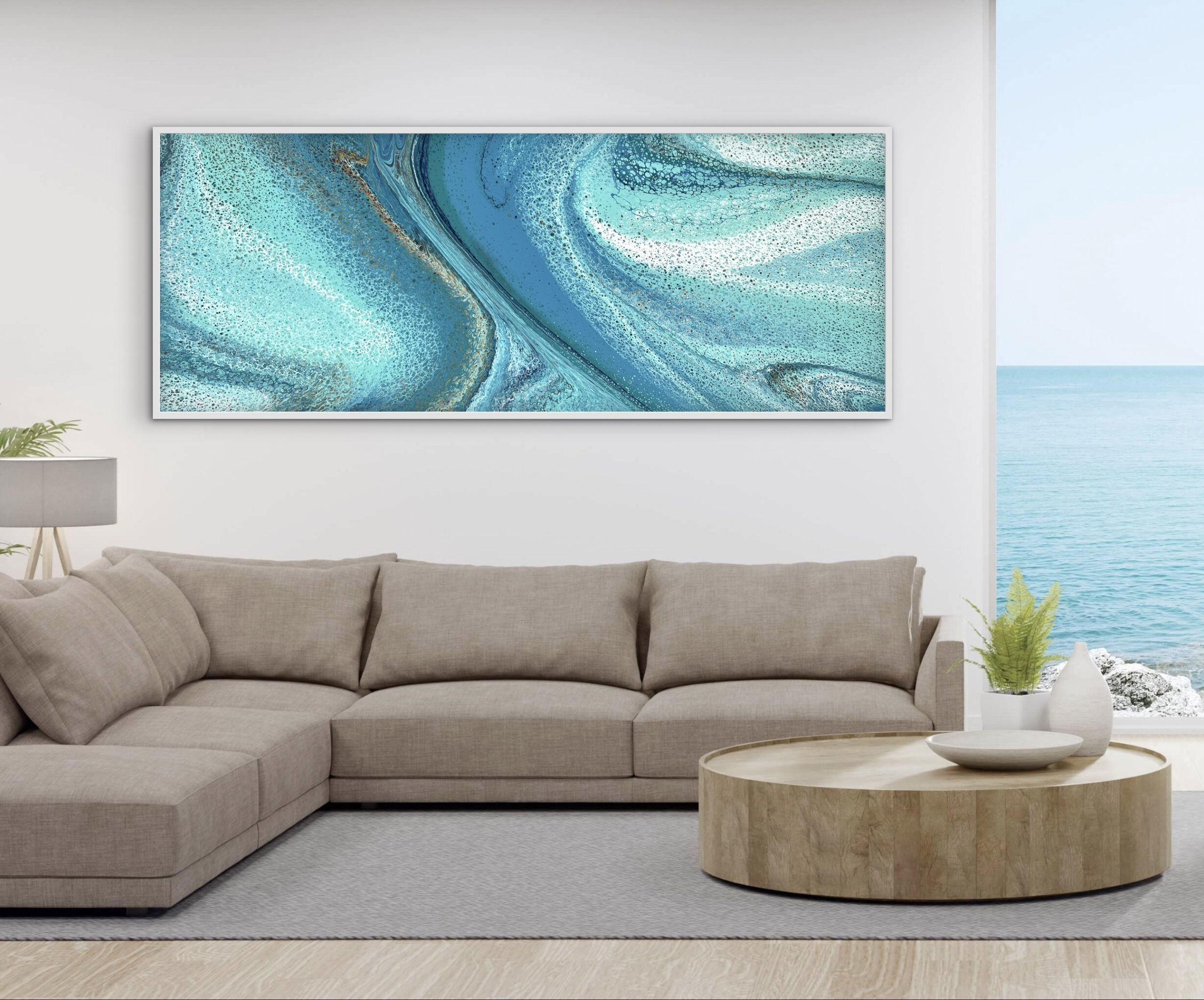 Created with fluid techniques to encourage movement and colour separation, the work reveals flowing formations where turquoise, teal, and aqua meet. Deep oceanic greens give the composition richness, while metallic gold and copper bring subtle warmth and dimension. Pigments shift gently with the light, echoing the shimmer of water along the shoreline.