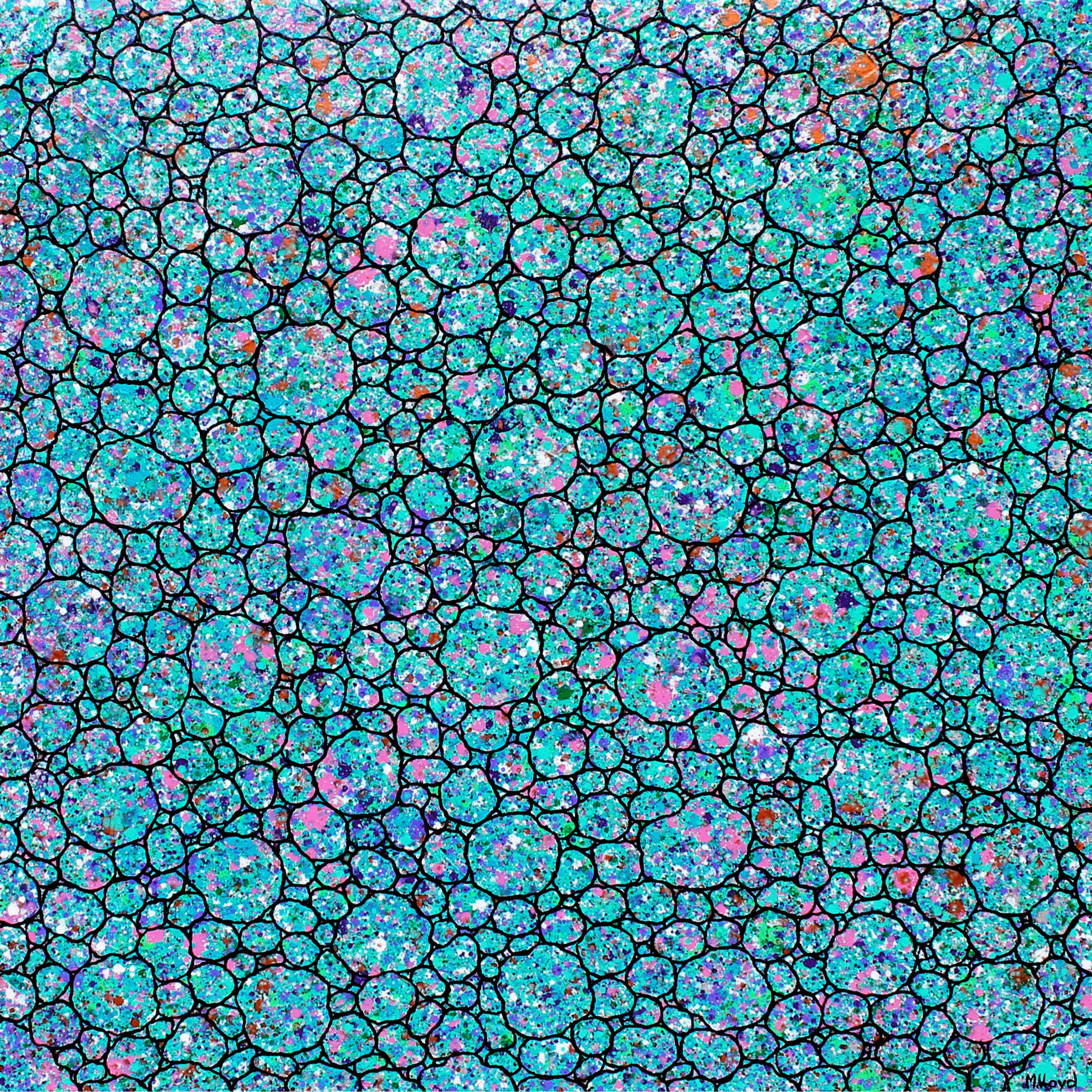 Coastal Garden Pebbles by Miranda Lloyd – This painting is part of my pebble series. The hues of this painting was inspired by both living in the country and spending time on the coast. This one I have introduced copper and purple with black-blue outlines. These paintings have become my relaxation paintings between doing my other paintings. The background has a light texture with dapples of greeny blues, greens, purples, copper, blues, pinks, silver and white. You know when I need some calming as I seem to do these styles of paintings when I have a bit of anxiety, this time my son starting school for the first time.