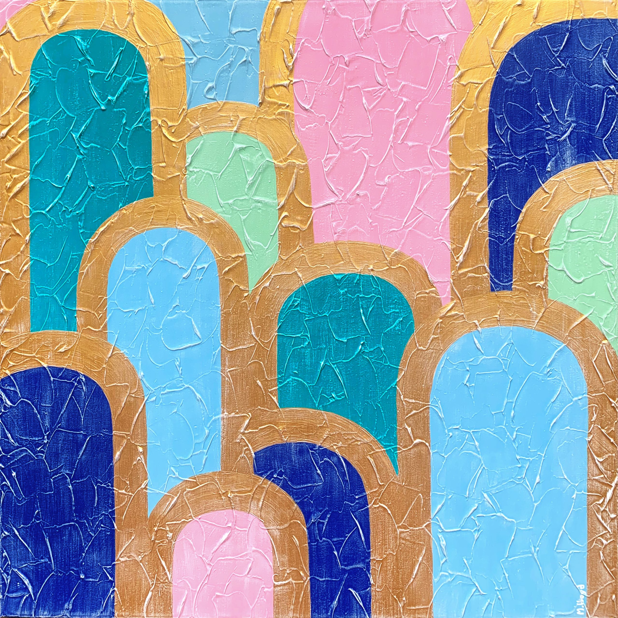 This is something very different to my usual nature art. This style is more geometric. I have a thing for metallic golds and have been painting a lot with metallic golds and goes so well with this palette of blues, turquoise, pinks and greens. This also reminds me of so many things, stain glass windows of a cathedral, buildings in the Greek Islands and the ocean. I feel a series coming from this one. The gold and colours have a white wash which brings out the textures of the painting. The turquoise is richer in colour than this photo and looks much better in real life as this one was very hard to photograph as the golds reflect differently depending on the lighting. Painted around the edges ready to hang.