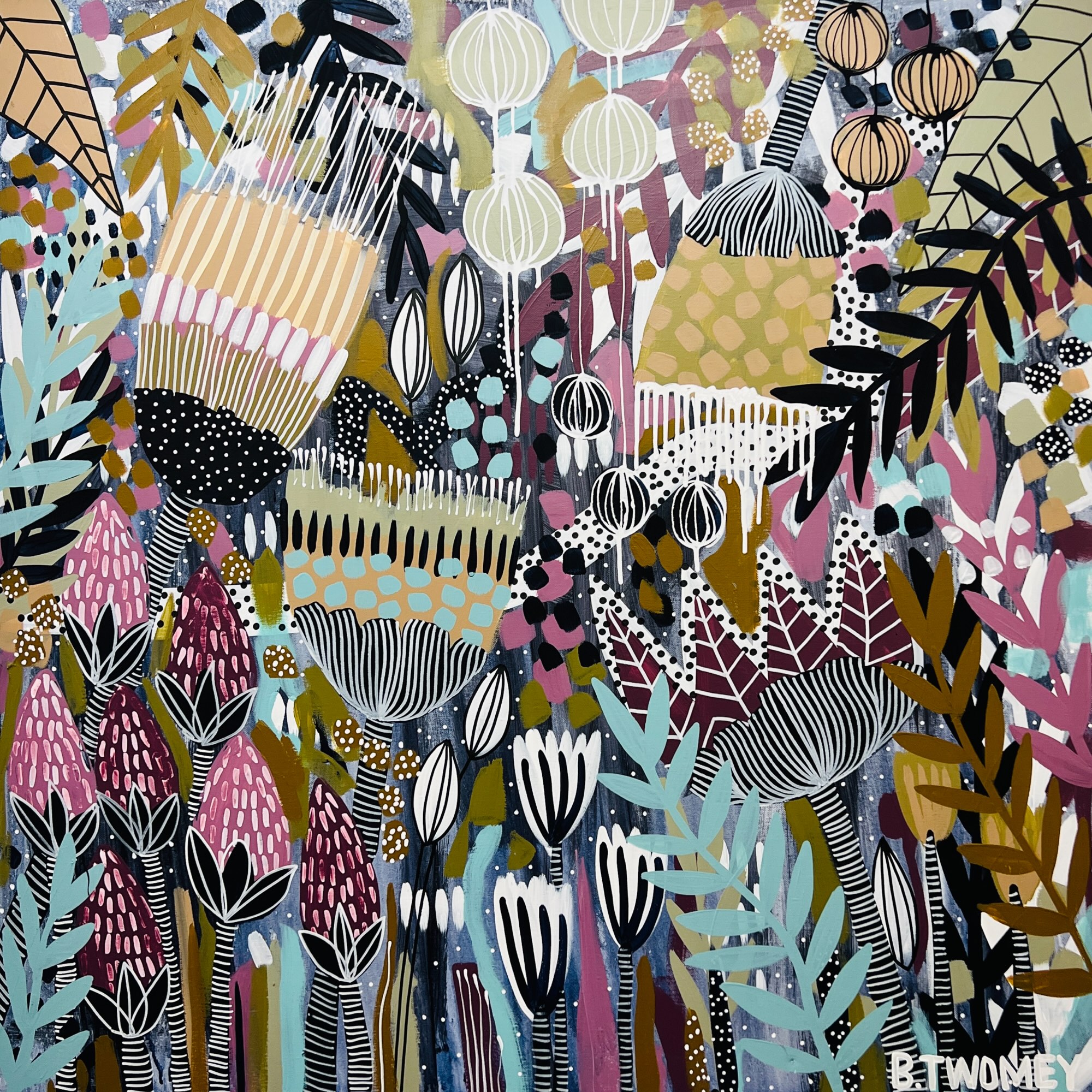 ‘Coastal Hideaway’ by Bernadette Twomey    A lush tapestry of native blooms and seed pods unfolds in soft sage, blush, ochre, and inky black, layered with delicate patterns and bold shapes; evoking movement, joy, and connection with nature. This vibrant botanical scene captures the wild beauty of nature in full flourish, inviting the eye to wander through its rich textures and colours.