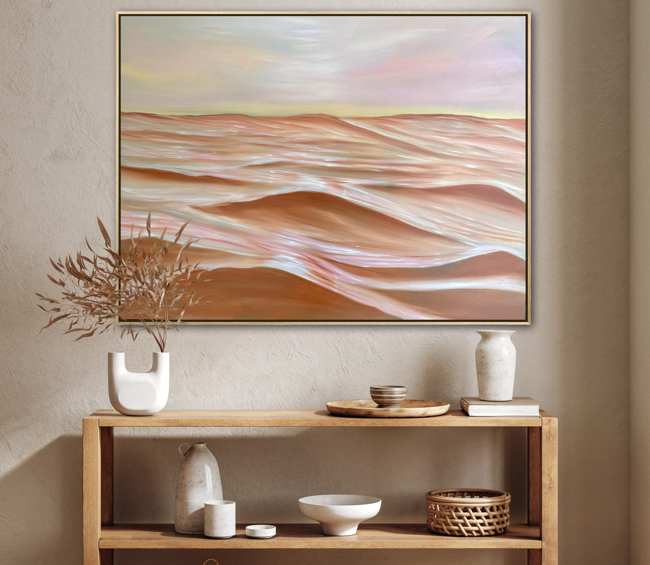 This painting of water is realistic with a painterly feel and can bring together earthy tones in a space. By having a horizon, it drawers the viewer to look out at the perceived distance creating the illusion of more space in a room.
