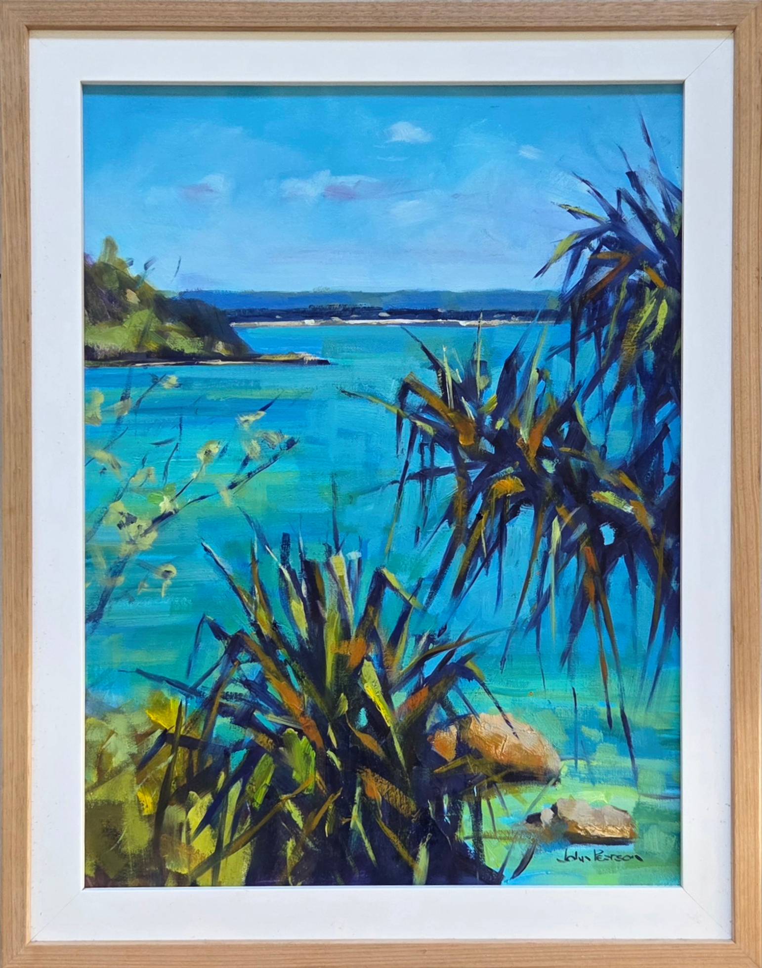 Depicts a view across a tranquil bay to a distant landscape viewed through some tropical trees