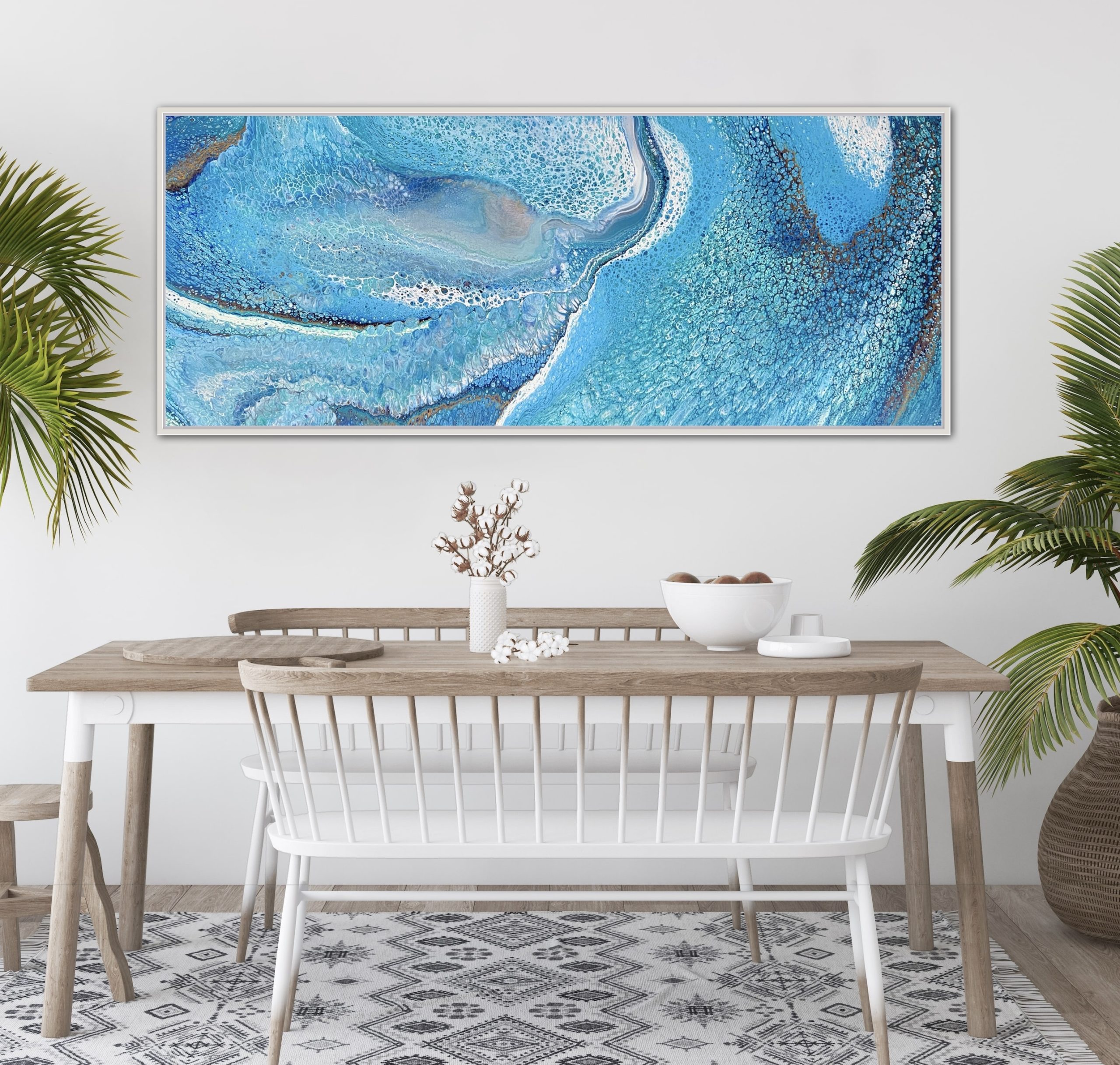 Coastal Palette was created using various techniques combined to allow increased flow, interaction and separation of colours to create interesting patterns where pops of colour can be seen emerging from underneath. This added dimension adds lace and cells to the artwork creating an interesting and one of a kind painting that can never be replicated.
