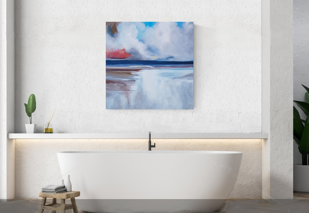 This work is derived from the beauty of the Australian South Coast. A storm looms in the background with thick heavy cloud formations in the distance, creating a scene that represents transformation. The wet sand is exposed leaving a glass like appearance creating reflectiions of the cloud formations and sky.