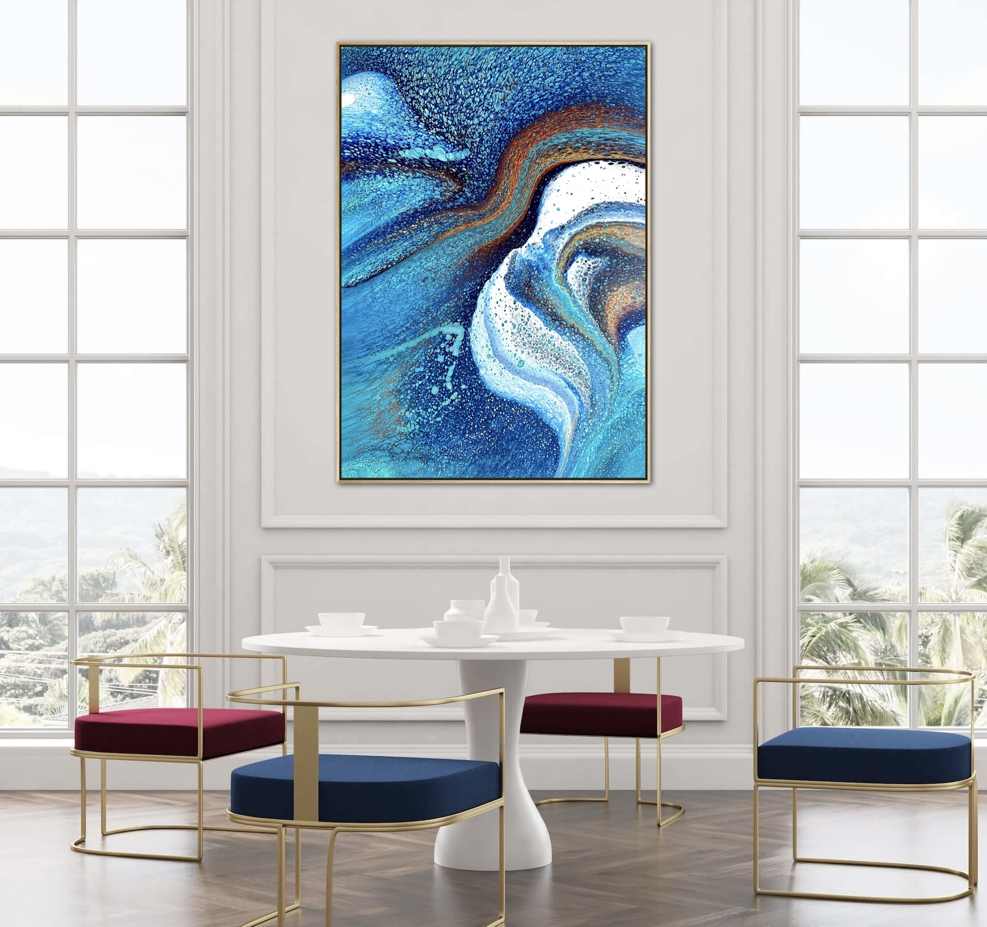 Coastal Rhythms was created using various techniques combined to allow increased flow, interaction and separation of colours to create interesting patterns where pops of colour can be seen emerging from underneath. This added dimension adds lace and cells to the artwork creating an interesting and one of a kind painting that can never be replicated.
