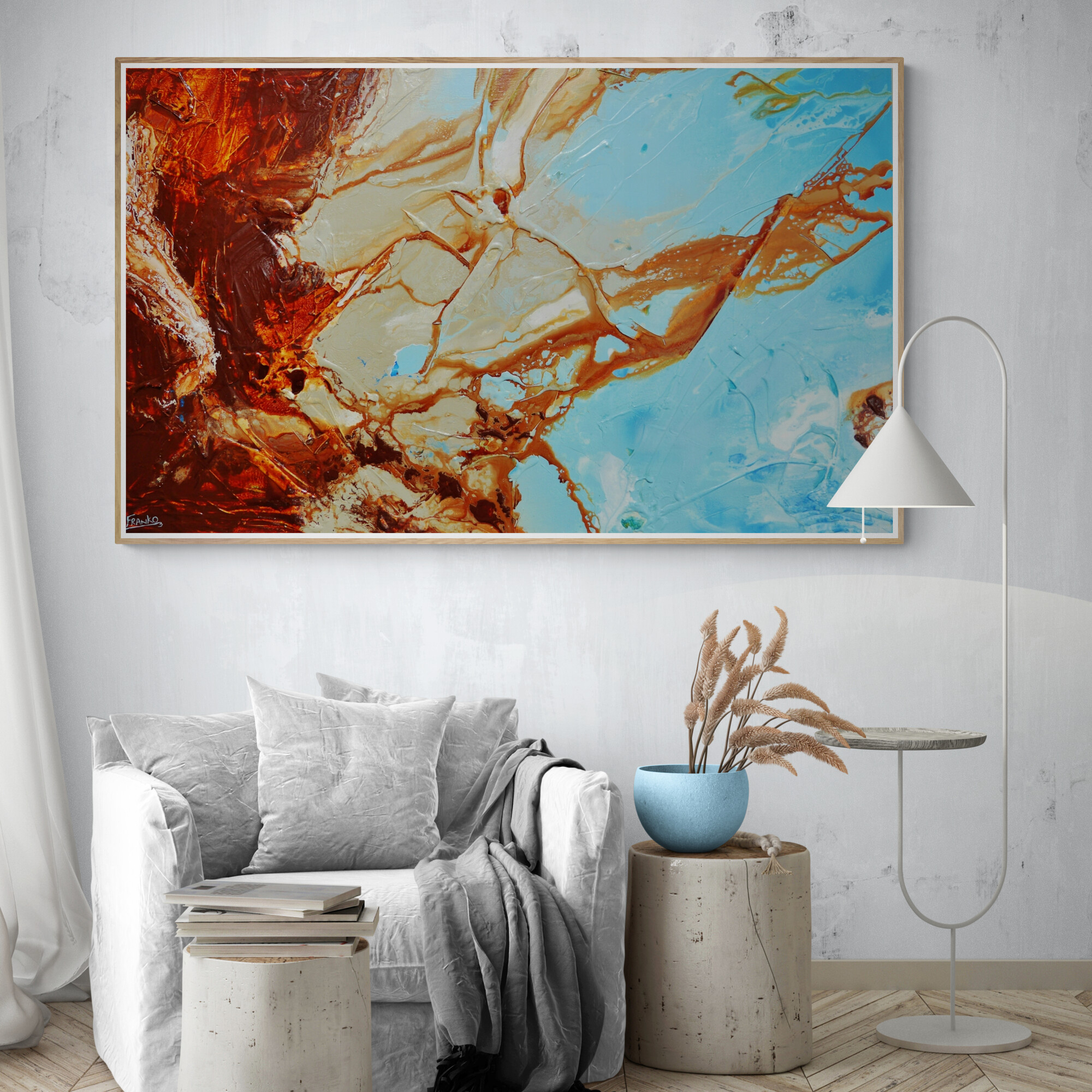 Provided with listings are some insitu images. We strive to ensure they are accurate in scale. Sometimes we will add an external frame to the painting insitu, to provide a vibe for how that would look also. As mentioned above, my pieces arrive ready to install with gallery finished edges and honestly, most people don’t add external framing. However, it is of course an option. If you have any questions, please let me know. We are here to help and want to make it as easy as possible for you if your décor aspirations require it.