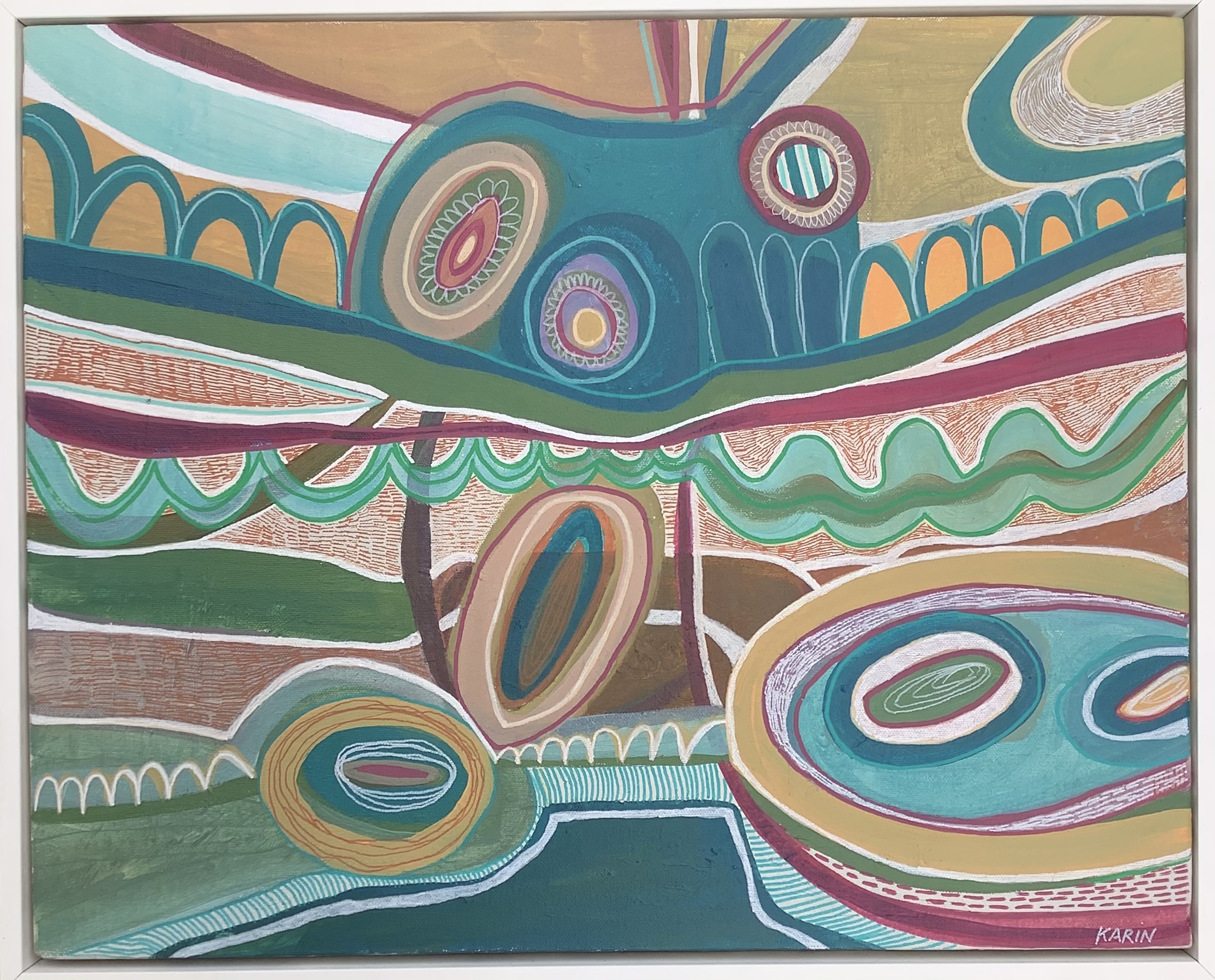 The Ebb and Flow of a Coastal Landscape with a focus on colour, movement, texture, composition and design. This is strictly an abstract interpretation of the laying of the landscape, the movement and patterns all  displayed in a stylised composition of shapes and lines.