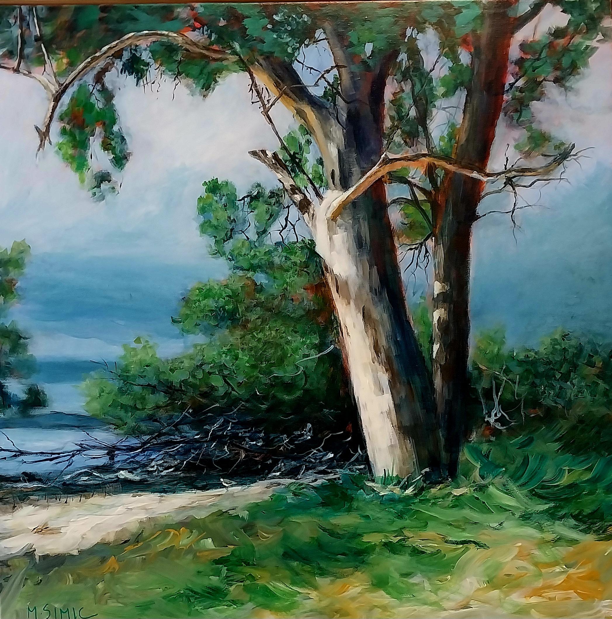 Coastal Scene by Millie Simic – A tranquil coastal scene featuring a behind the clouds, sunlit eucalyptus tree standing at the water’s edge. Soft grey-blue tones of sky and shoreline contrast with the textured greens of foliage and grass, creating a sense of calm and gentle movement. The layered brushwork captures both the solidity of the trunk and the shimmering atmosphere of the surrounding landscape.