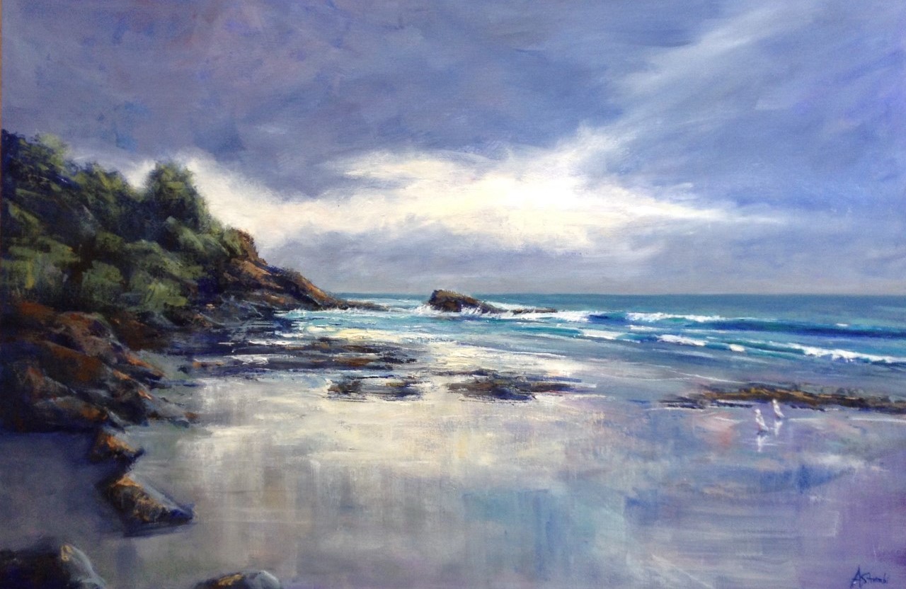 I started this painting in a workshop and thought about how to turn it into a painting that reflected my own ideas and impressions, using some photos taken on an early morning walk at Yamba, NSW. I wanted it to be a depiction of a sunrise in any beach location, with the promise of a new day. I also wanted it to convey the feeling of a fresh start and the optimism that each new day can bring. I painted the rocks and waves with a palette knife to give it lots of texture.