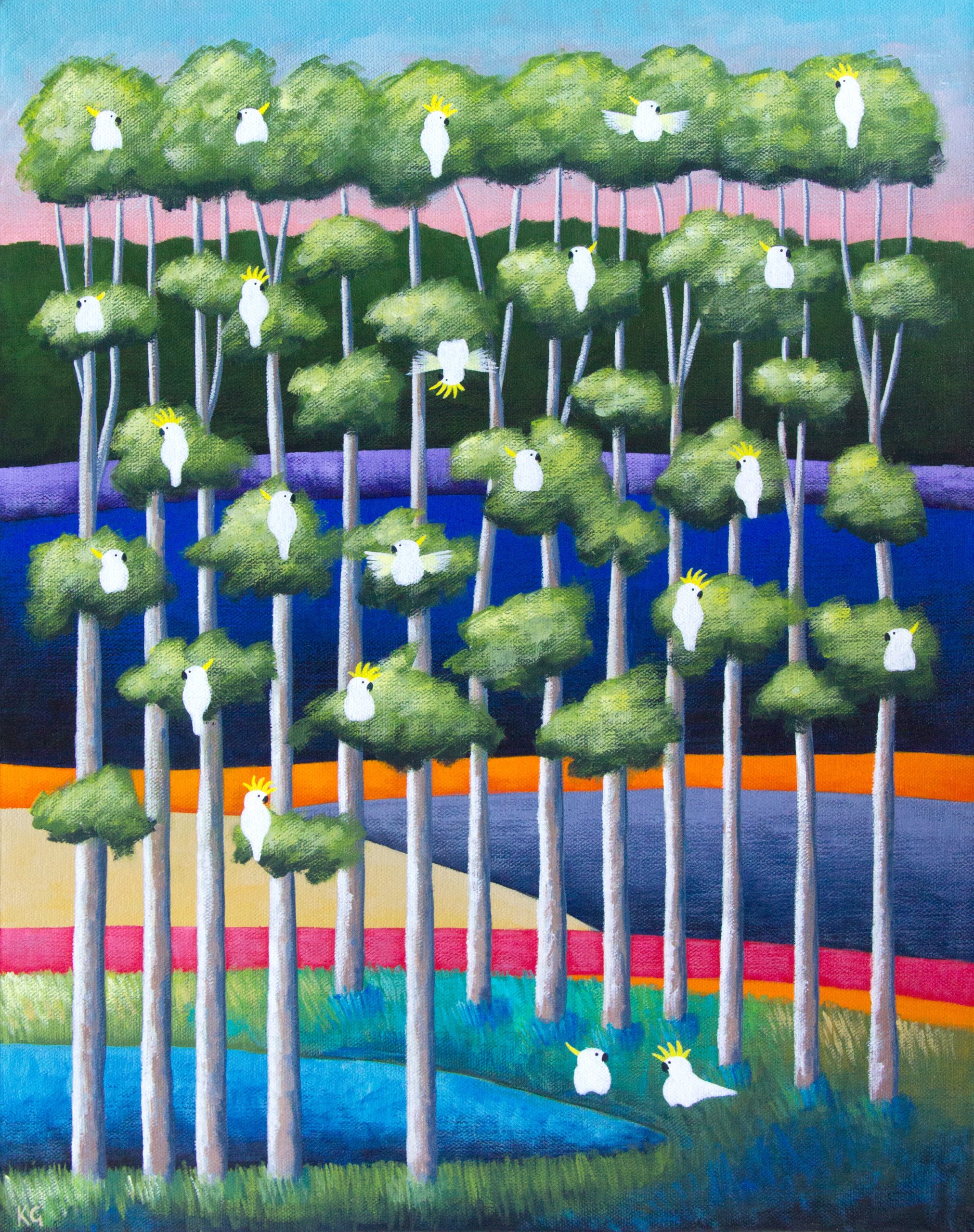 Cockatoo Canopy No.2Â by Kate Graham. A forest scene in thick textured paint in coloured bands including purple, blue and green, and highlights of striking orange and pink. Add the flock of cheeky cockatoos that occupy the canvas with naive frivolity, this piece becomes a whimsical celebration of nature. Style is loose and painterly, giving it a textured charm that matches the naivety of the subject matter. Inspired by the colour field paintings of last century, the colour scheme becomes not only the background to the trees, but an important feature of the painting. This painting would make a great addition to any home, office, nursery, living room or bedroom, a real conversation piece. Painted on quality canvas, hooks and wire on back so ready to hang. Sides also painted in a continuance of the composition, so no need to frame.
