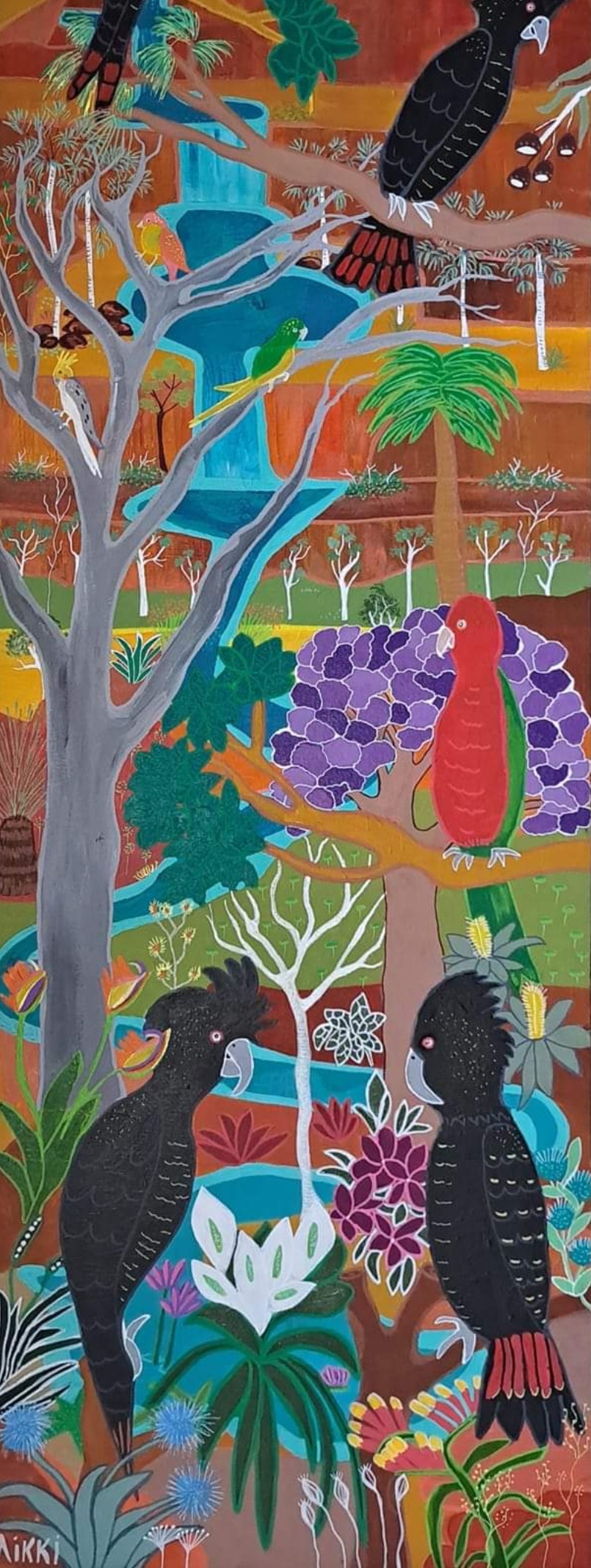 Cockatoo Court by Mikki Campbell – More black cockatoos, i have a connection to these amazing birds, i believe they have a spiritual connection to.this land, to me and to my art. I think youll find them popping up on and off in my work.