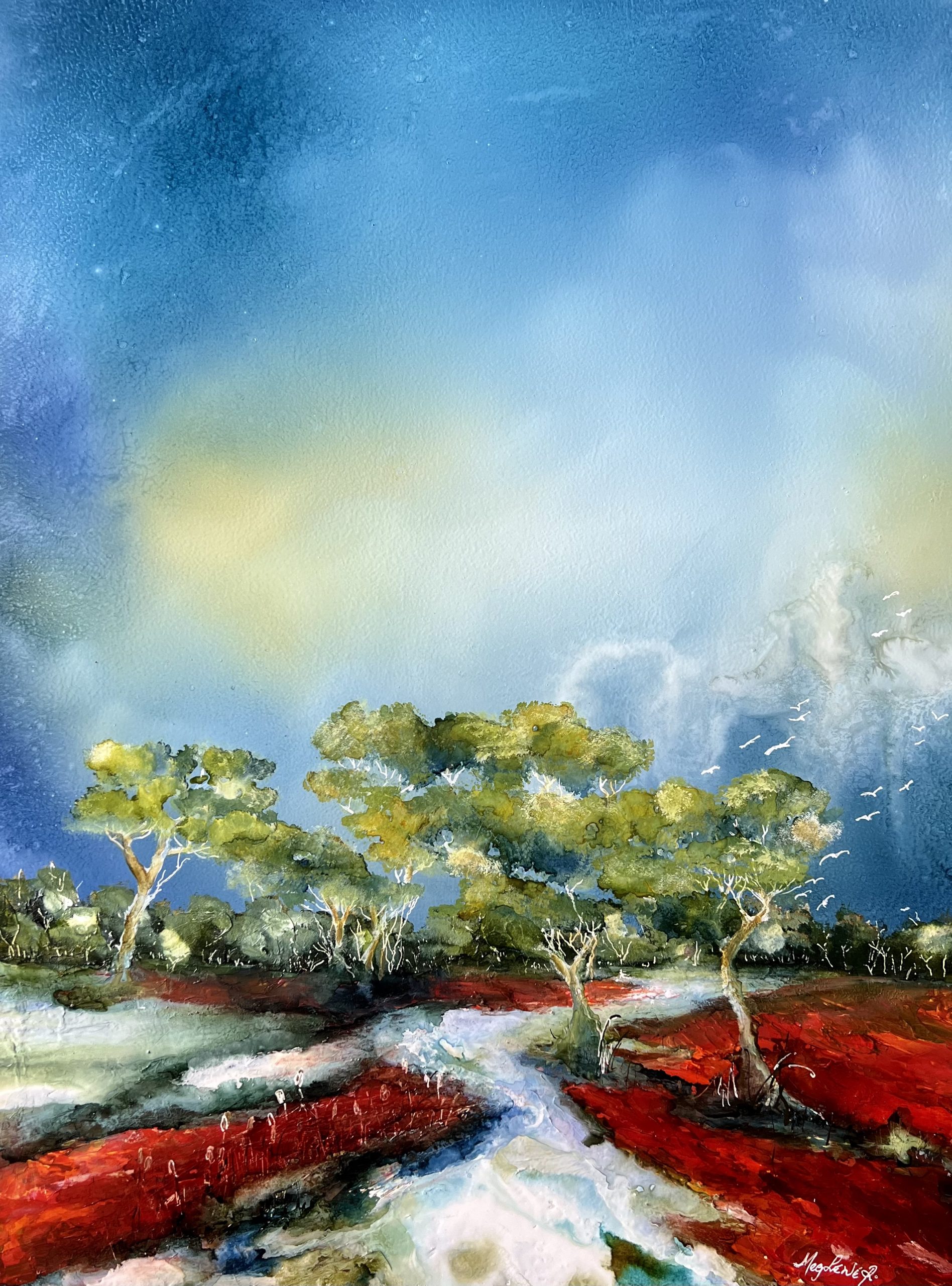 by tracks of egret, finch and jabiru,